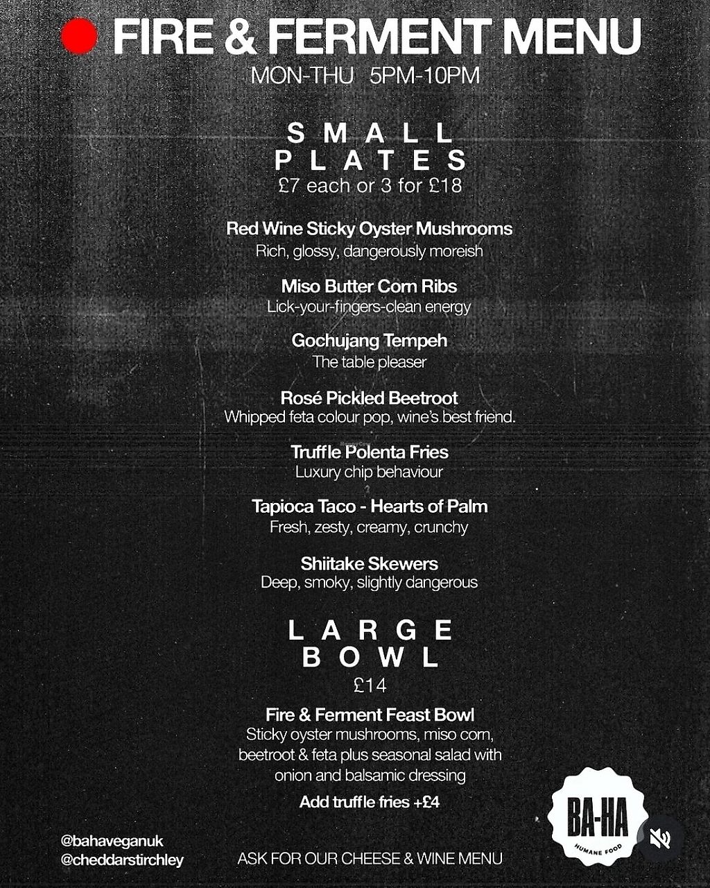 Serves meat, vegan options available. Wine and cheese bar offering clearly labeled vegan and veganizable dishes like Shiitake skewers, Miso butter corn ribs, Truffle polenta fries, and Gochujang tempeh. Open Mon-Thu 17:00-22:00. Closed Fri., Sat. & Sun.