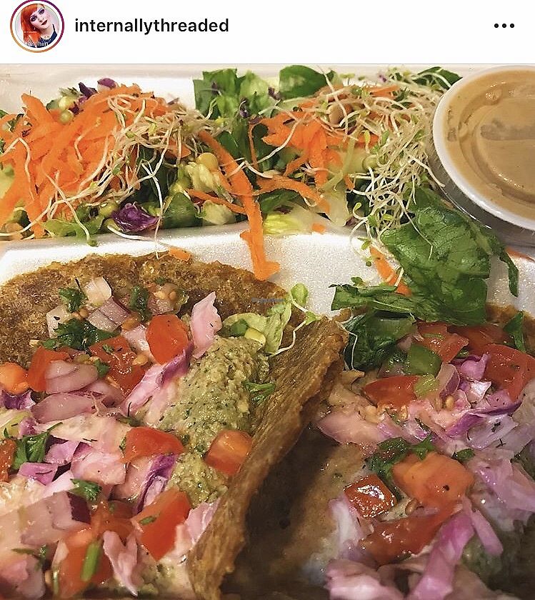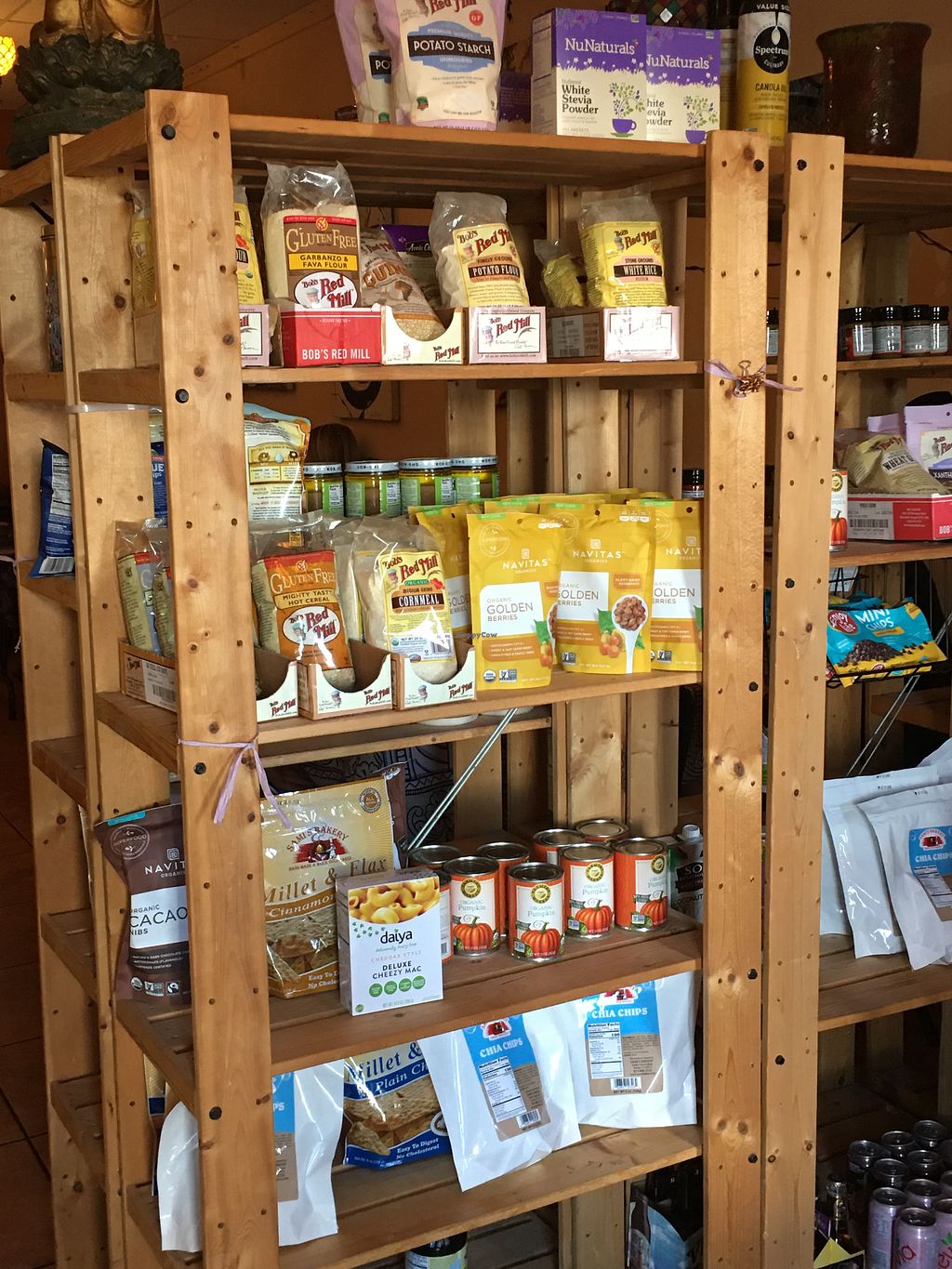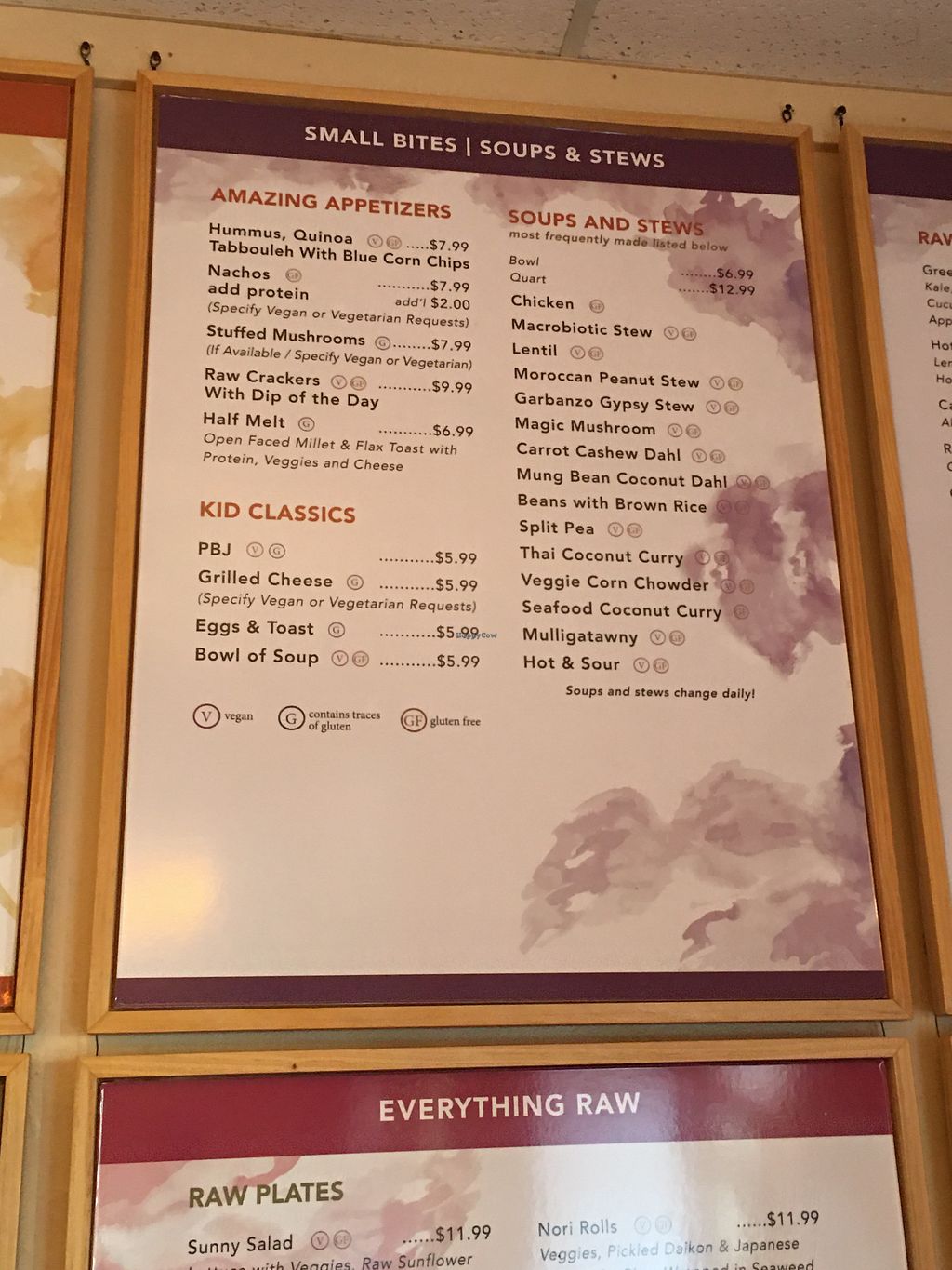 Serves meat, vegan options available. Juice bar with wheatgrass, organic food, bakery with vegan and gluten-free items. No refined sugar used. Also sells a small section of grocery and bulk items. Casual artistic atmosphere. Reported closed November 2021.