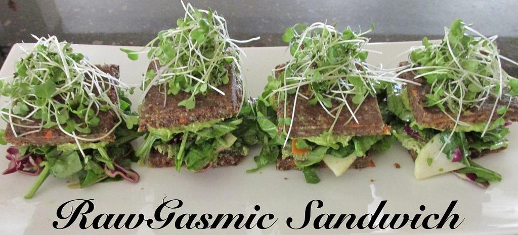 What we did get was a wonderful raw meal starting with the Rawgasmic Sandwich, this was fantastic. My partner and I ate it up instantly, and would have shared another one easily. The gluten-free raw vegan bread they make is wonderful, and the combination of seasonings and fresh ingredients including sprouts, bell peppers, zucchini, etc...worked very well in this dish.