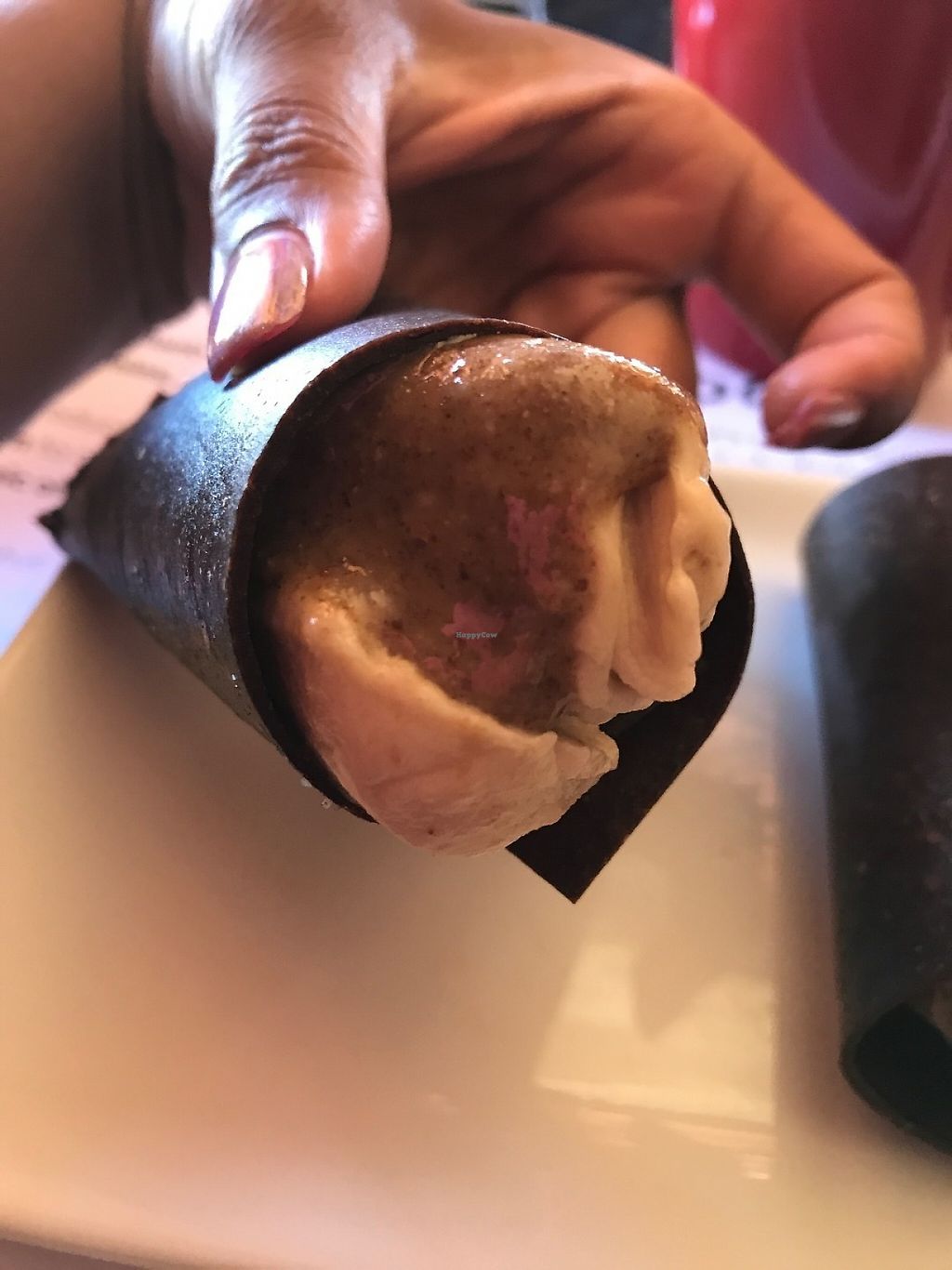 CHOCOLATE CANNOLI @ $13 - 2 chocolate crepes filled with banana ice cream and what seemed to be a date-based caramel. My dish was missing the chocolate drizzle that they show on the picture, but it was delicious nonetheless. The chocolate crepes were very rich and sweet. It was like biting into pure cacao. I’m not a banana fan, so I was pleasantly surprised at how delicious the banana ice cream was inside the crepe. Excellent dish, and it’s unbelievable that it’s raw.