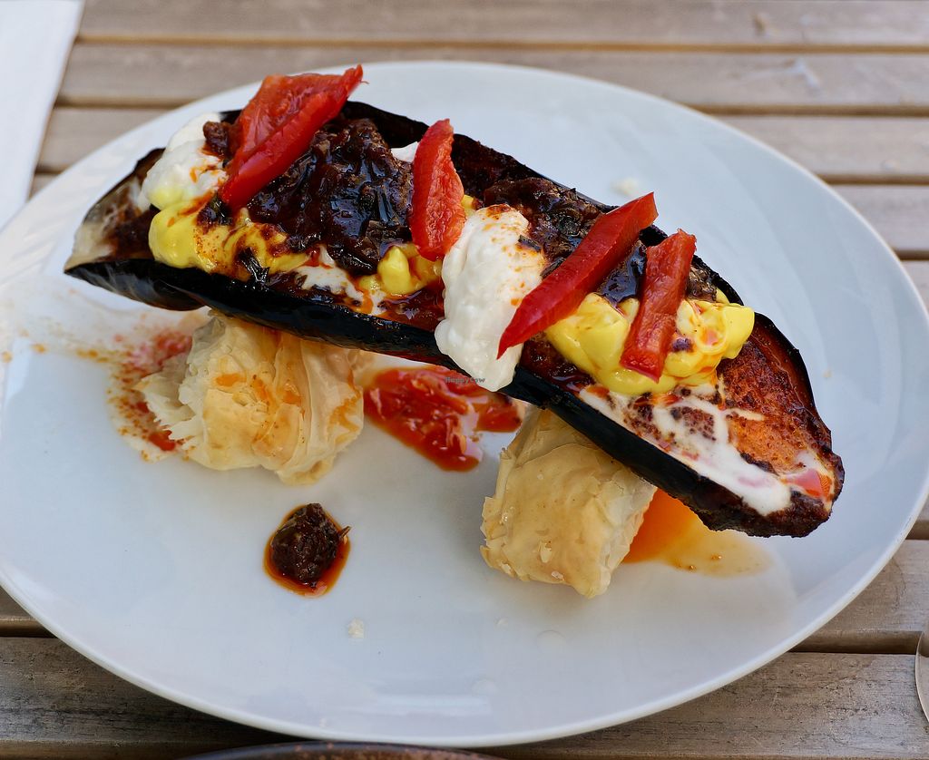 ASSIMA AUBERGINE FUMÉE AU ROMARIN RÔTIE SUR LIT DE FEUILLE YUFKA