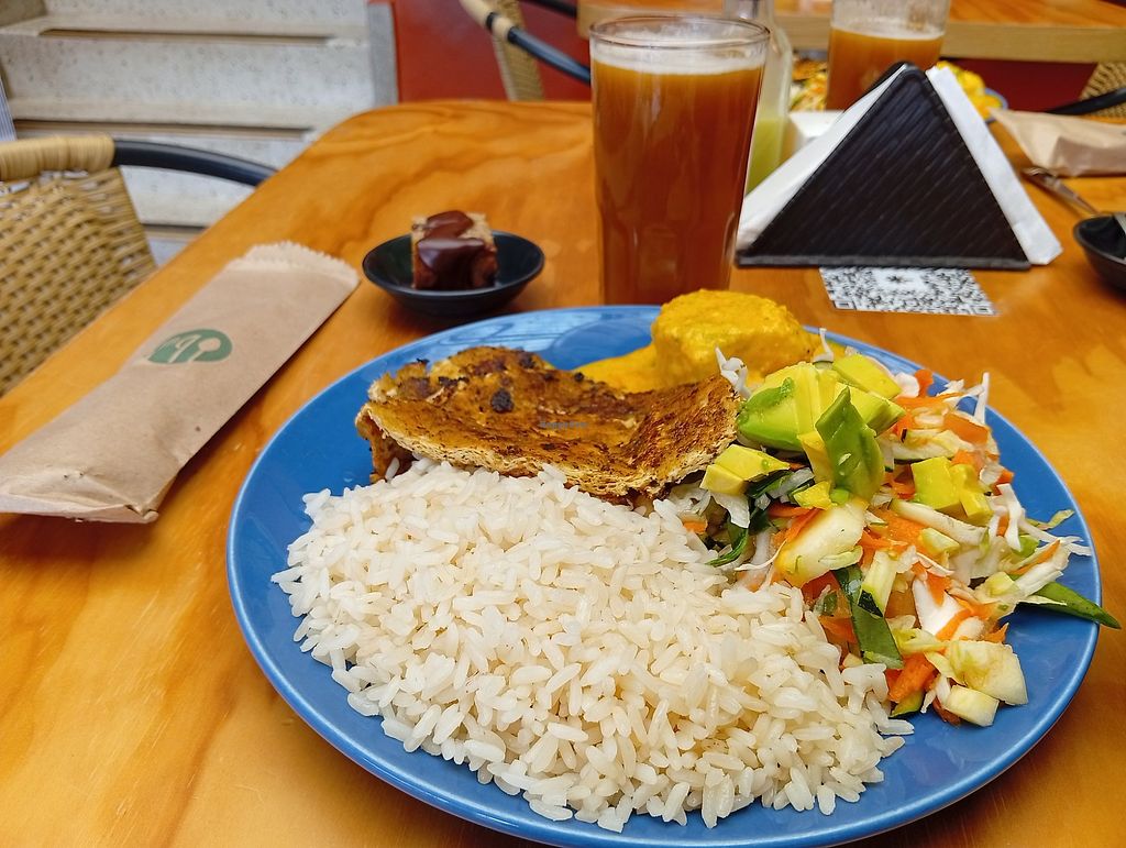 Milanesa de no-pollo, papa cremosa, arroz, ensalada, jugo de lulo y d…