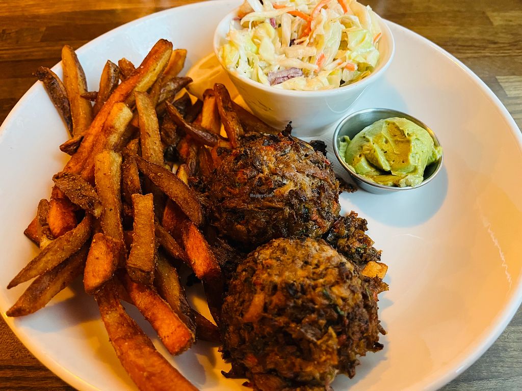 It was nice to see a vegan option at a seafood restaurant, and also nice to see a vegan option in general that wasn't a Beyond burger or house salad. The mushroom cakes with fries and slaw were their only option. Our waitress confirmed that they use vegan mayo in the coleslaw. The mushroom cakes were well seasoned but a bit greasy (as others have mentioned), but the portion was good, and I appreciated the effort. I probably wouldn't seek this meal out in the future if I'm on my own since the vegan options in this area have been steadily increasing, but I would definitely get it again if I'm out with non-vegan family/friends.
