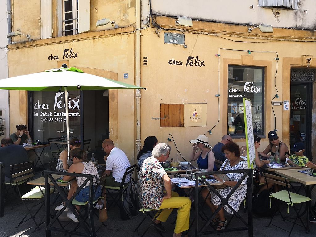 The food is great. 5 stars. Right next to the Arles arena. Best Vegan food I had to date in France. Biologically sustainable. Very friendly service. If you want to be sure of a place outside, overlooking the arena best call ahead and reserve a place outside. When you are in Arles, look no further, just eat here!