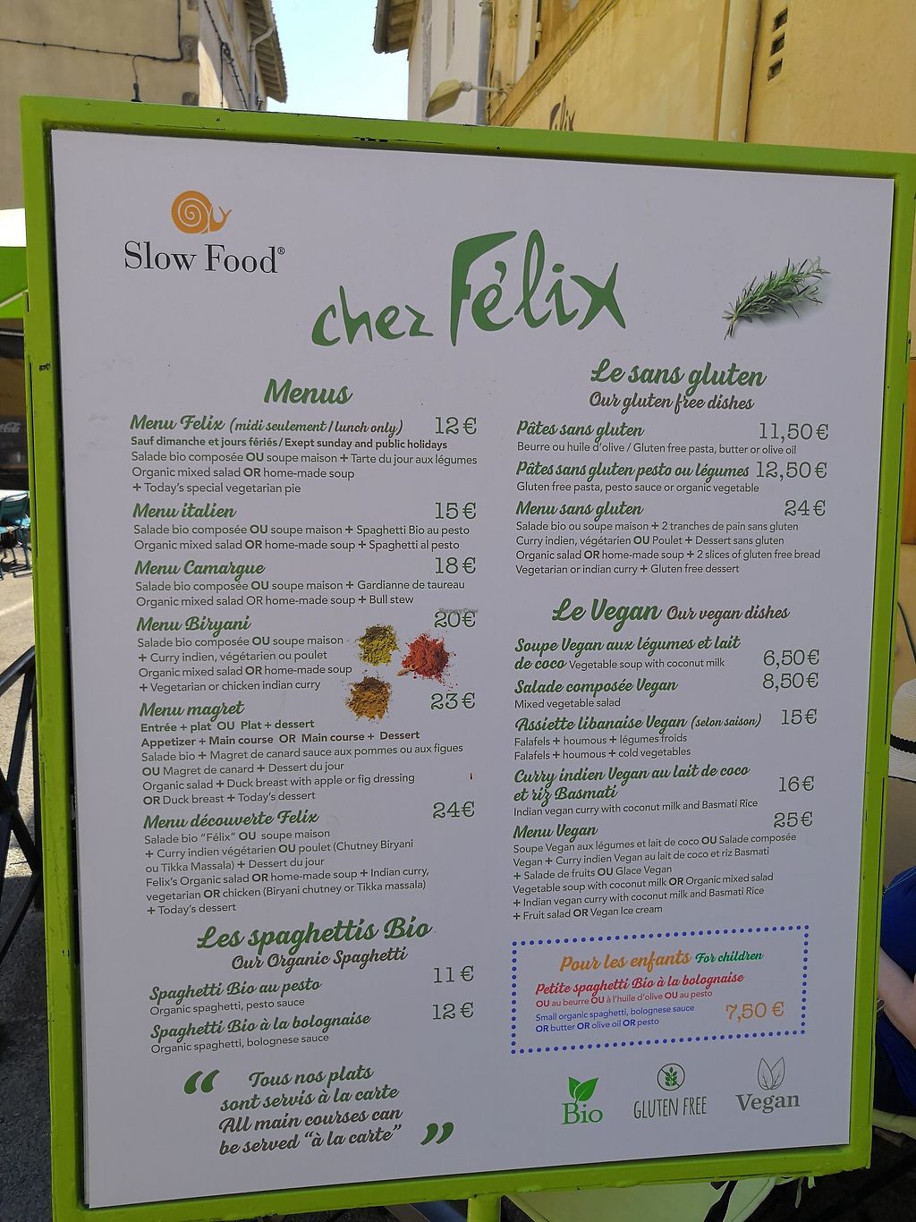 We ate at Chez Felix a few weeks ago. When we entered, we asked the chef if they had some ‘végétalien’ dishes. He enthousiasticly answered that the soup was vegan and also the vegetarien curry wok. To be certain, we asked if it was without dairy and/or eggs – everything was okay! Glad we found some vegan food, sat down on the terras, next to an old Roman Arena. The soup was pumpkin soup, which was good, but we did add some extra pepper. The wok was spinach and lentils in a coco-curry sauce with some rice. The flavor was really good, we enjoyed our meal and were happy with a nice dinner, lovely temperature and the typical France view. The service was absolutely great, the waitress didn’t speak a lot of English but did the best she could (and we are lucky to know some French). If you are ever in Arles, don’t hesitate to check out Chez Felix, there’s probably gonna be at least one vegan dish on his menu.