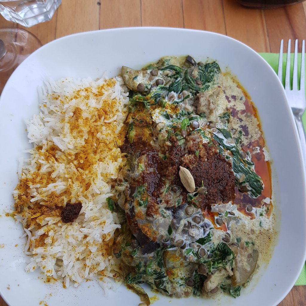 Really nice location, especially if you’re sitting outside. They have one vegan dish of i’m right, but you can order it separate or in a menu where you also get a salad and a dessert. I only got the curry which was nice but there wasn’t any protein source and a bit too much rice. Also, the vegan and vegetarian curry are the same which was when they gave it a bit of a “uhm you sure it is vegan” moment😉The curry which was claimed to be Indian wasn’t spicy at all, but they gave a spicy saucy thing. Really nice staff too! But great to have a vegan dinner option in Arles😄