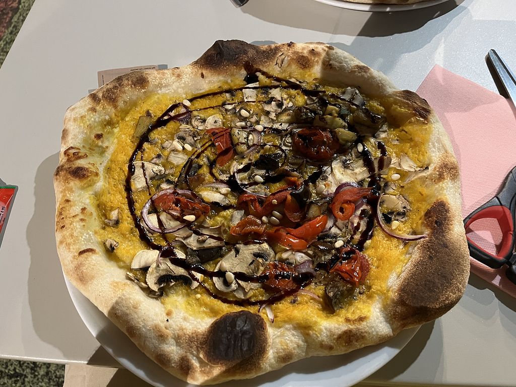 The pizza sauce was made with pumpkin and as topping there were tomatoes, eggplant, arugula, mushrooms