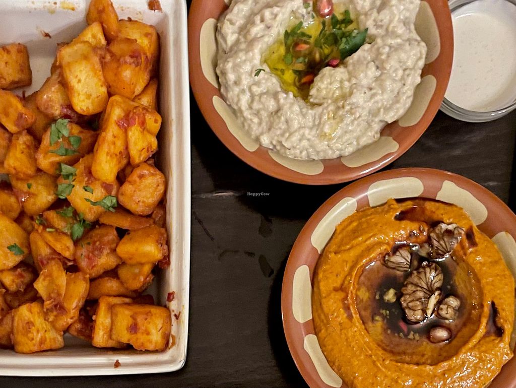 They serve Musabaha for everybody which isn‘t vegan, are out of spinach bi tum. Fattousch tastes old, Batata Harah lack garlic, pepper, Muhammara is spicy. Coriander dominates the Falafel, Magdous lack sweetness, walnuts.