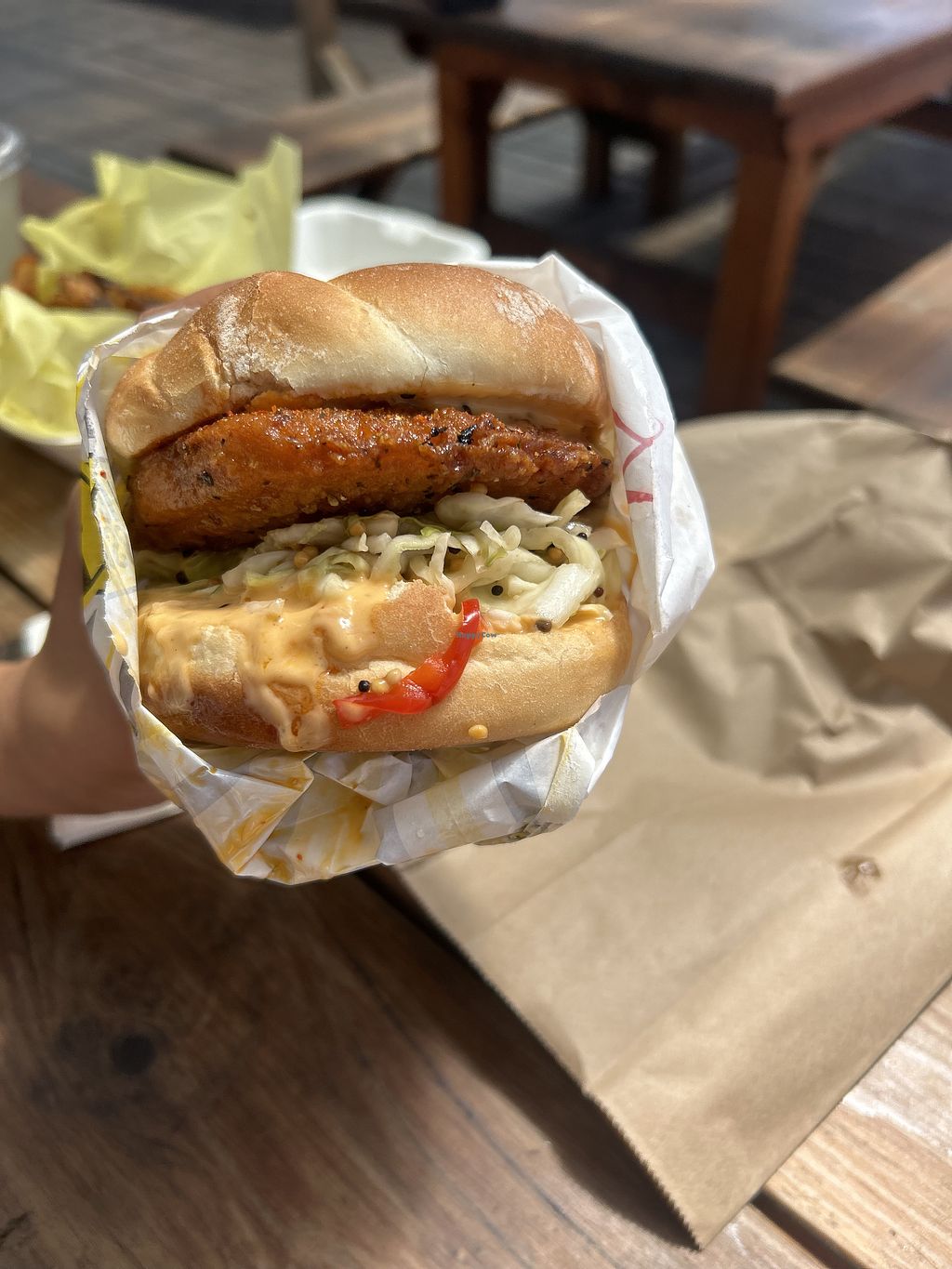 This place was a pleasant surprise. I always thought they just had chicken sandwiches until I looked up their menu. Chef Seth has created a plant based menu with options such as fried chicken sandwiches, chicken tender baskets and black garlic fries. We got the hot honey and the bangcock hot chicken sandwiches with black garlic fries and they did not disappoint! There’s outdoor seating with misters around the trellis for hot days and ample seating.