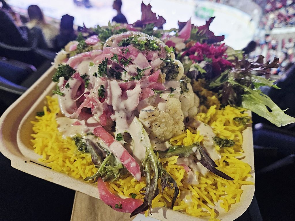 Calamachick (vegan calamari made with mushrooms) with rice and salad. …