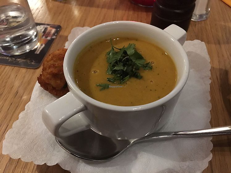 Took a bit of a gamble in going here as there were no previous reviews to go by and I was travelling quite a distance to go there. However, I was not disappointed. This is a lovely little restaurant-[censored]-bar with a friendly atmosphere. The staff were lovely and spoke fluent English (making up for my bumbling German). The menu is all vegan and appears to be ever changing with a Daily Specials print-out. There are many options for mains - I had the Flammkuchen which I would describe as a very light pizza. The ingredients were fresh and the meal was tasty. For dessert there was one option which was a Schokolade Creme Brulee with fruit. This was something a bit different but still very nice - kind of like a chocolate moose and candy combination.
