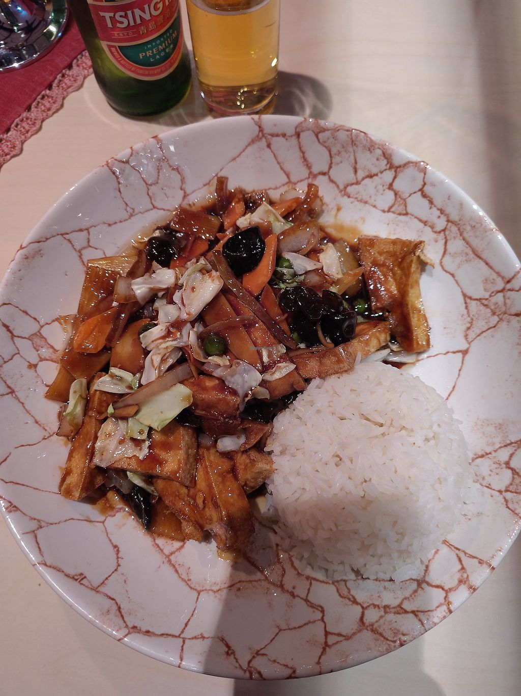Vegan dish with vegetables, tofu and rice in a tasty sauce