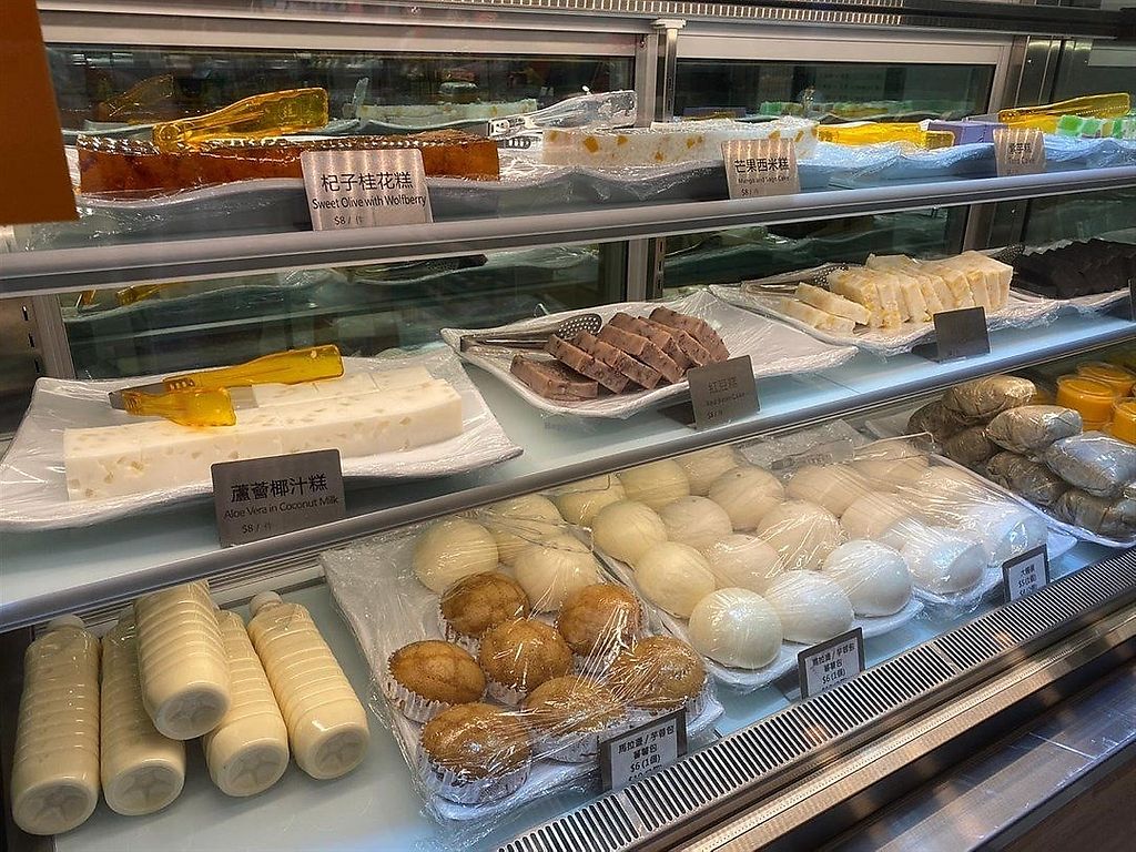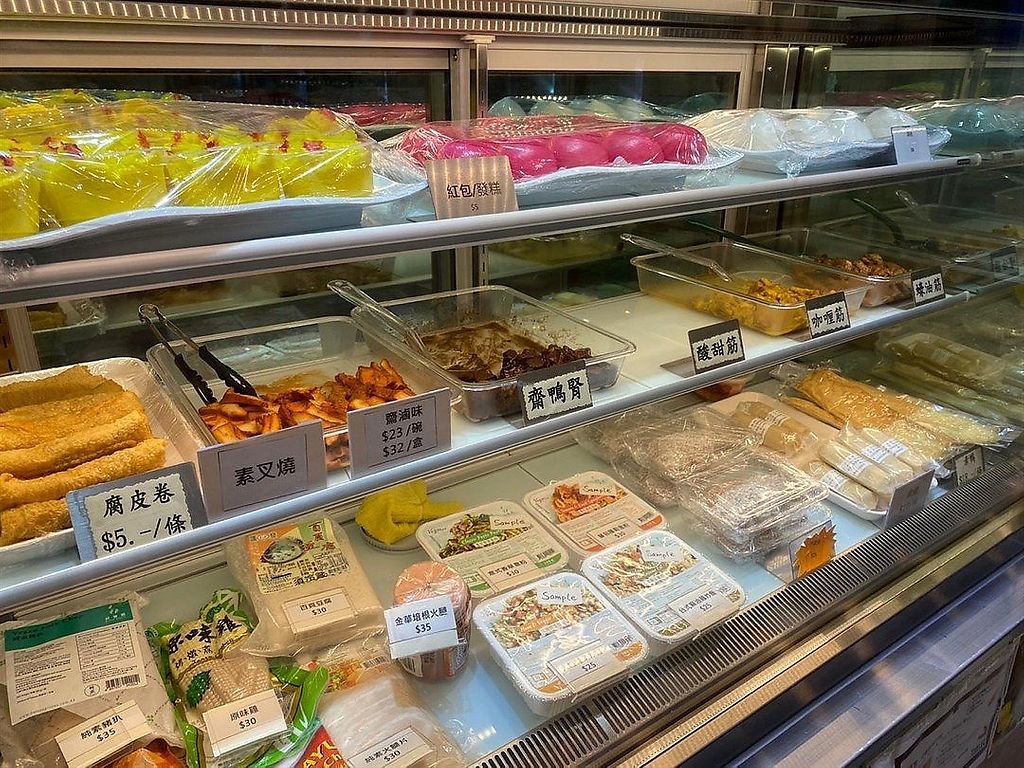Vegetarian takeaway counter selling desserts, savories, mock meats, and sweet buns. One of several outlets. Reported closed October 2021.