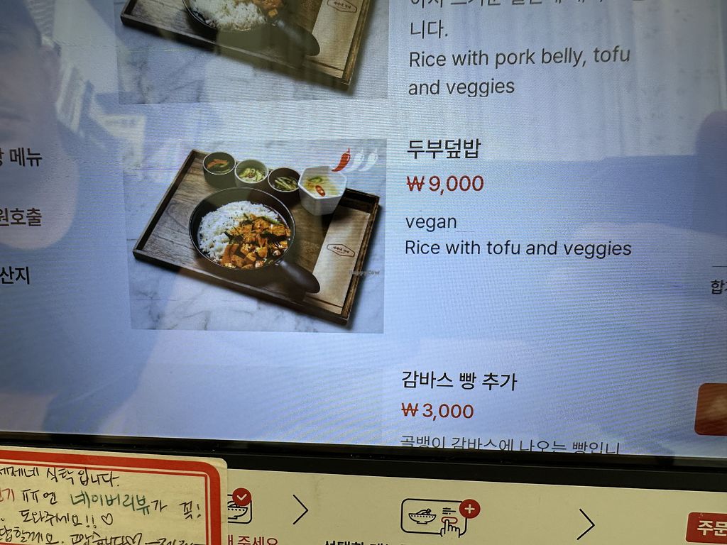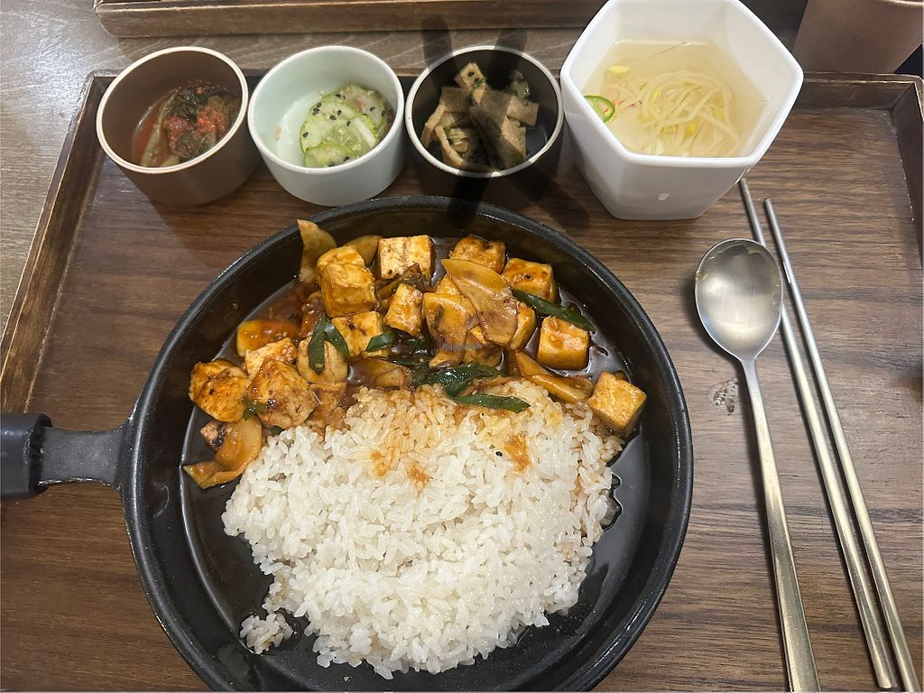 Having struggled in South Korea to find vegan options, finding a vegan option in the menu here was great. Really tasty meal, tofu, rice and delicious. Can't recommend enough.