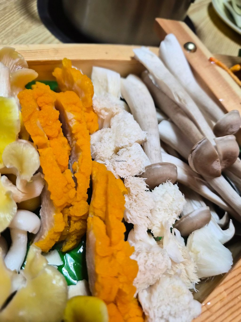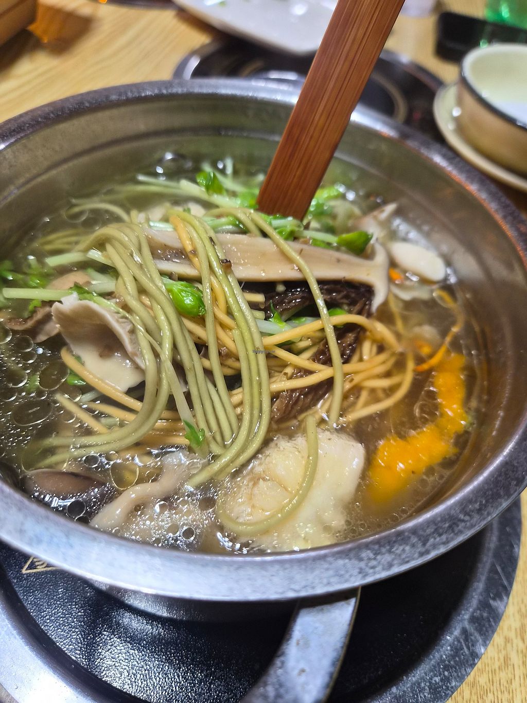 The hot pot comes with an impressive variety of mushrooms, some of which I had never seen before. We also got tofu, and some noodles on request. We ordered the cheapest option and didn't get any other vegetables like kelp or fresh greens but maybe other packages had this. The broth was tasty, friendly and helpful service. The dipping sauces were fine but missing garlic onion and coriander, I think because it's Buddist.