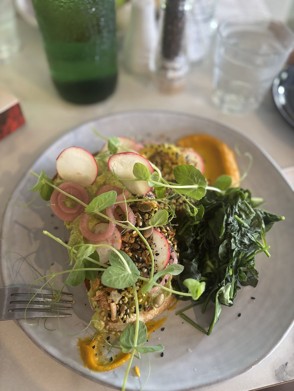 We shared the two vegan lunch options (smashed avo and pakoras with cauliflower puree), which were both tasty. Quick service!