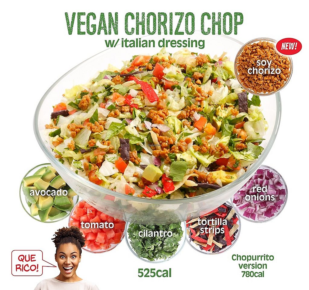 Serves meat, vegan options available. Chopped salads, wraps, and burrito bowls. All salads can be made vegan as can the chopurrito (salad burrito bowl). Offers build your own and menu listed chopped salads with a wide variety of greens, grains, veggies, and fruits from which to choose. Warm bowls made on a base of vegan cilantro lime rice are also available. Multiple locations. Reported closed January 2024.