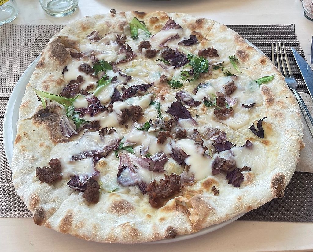 Vegan pizza with vegan mozzarella, chicory and vegan bacon