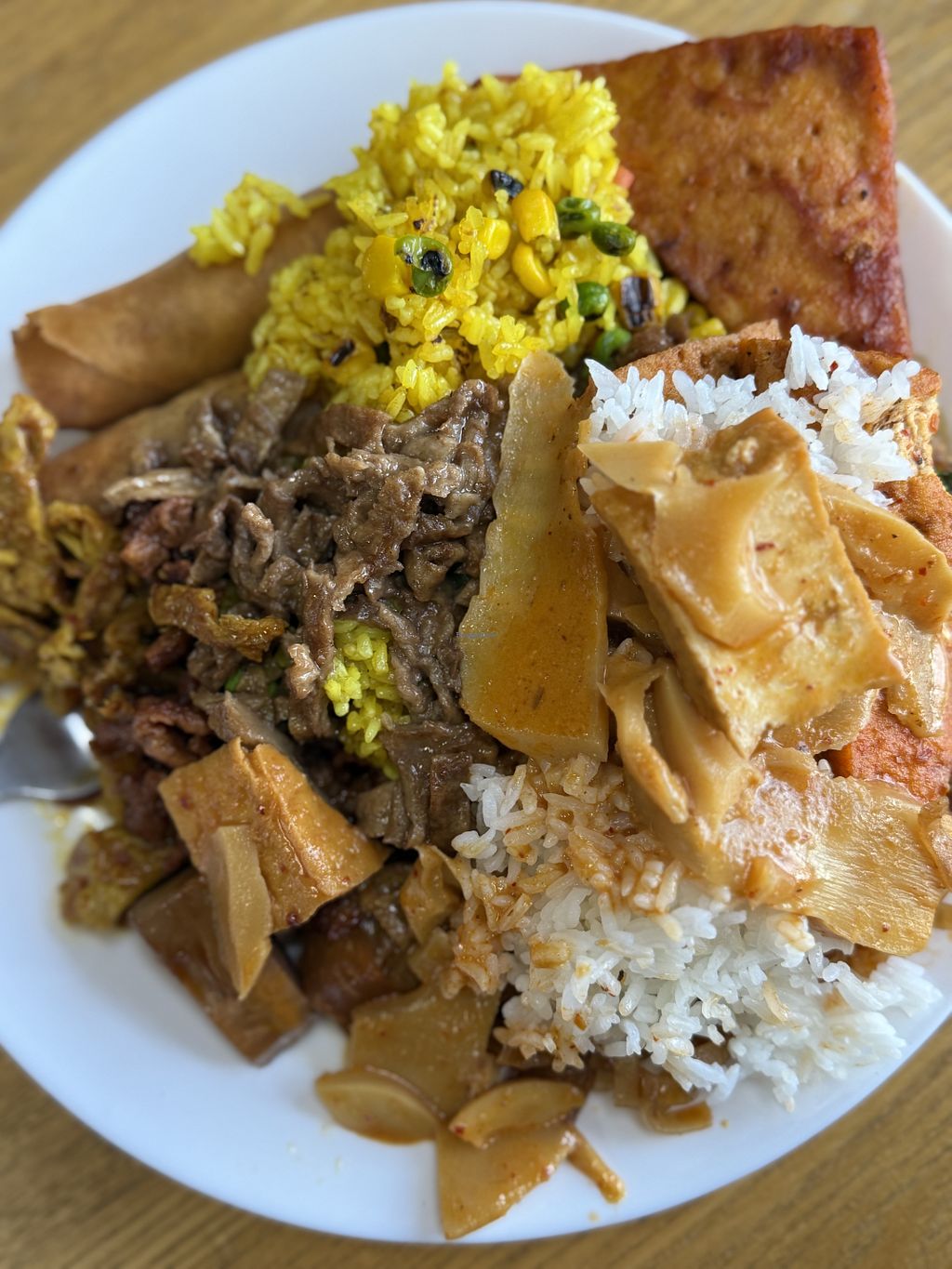 Plate of assorted food from buffet including tofu skins, veggies, and …