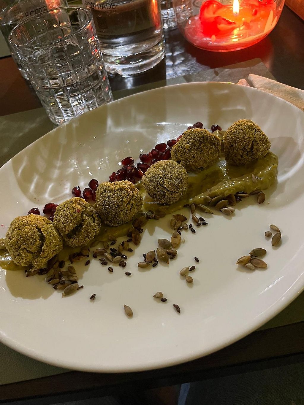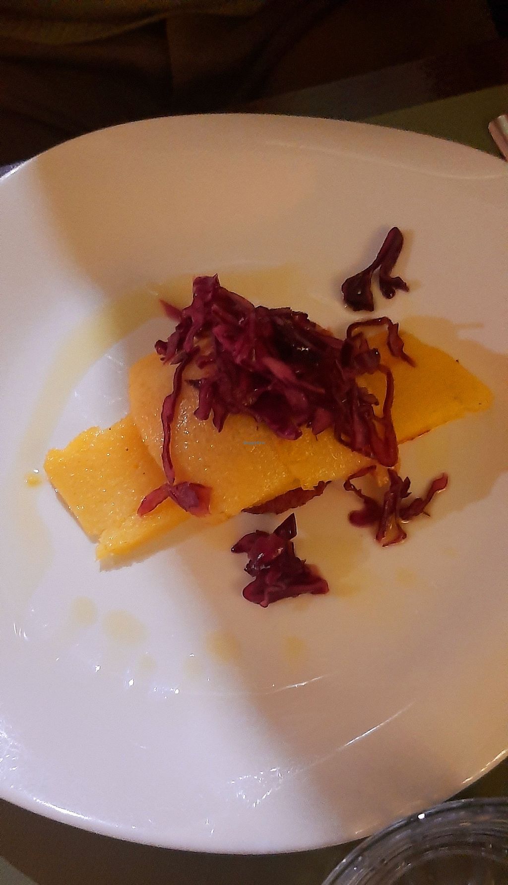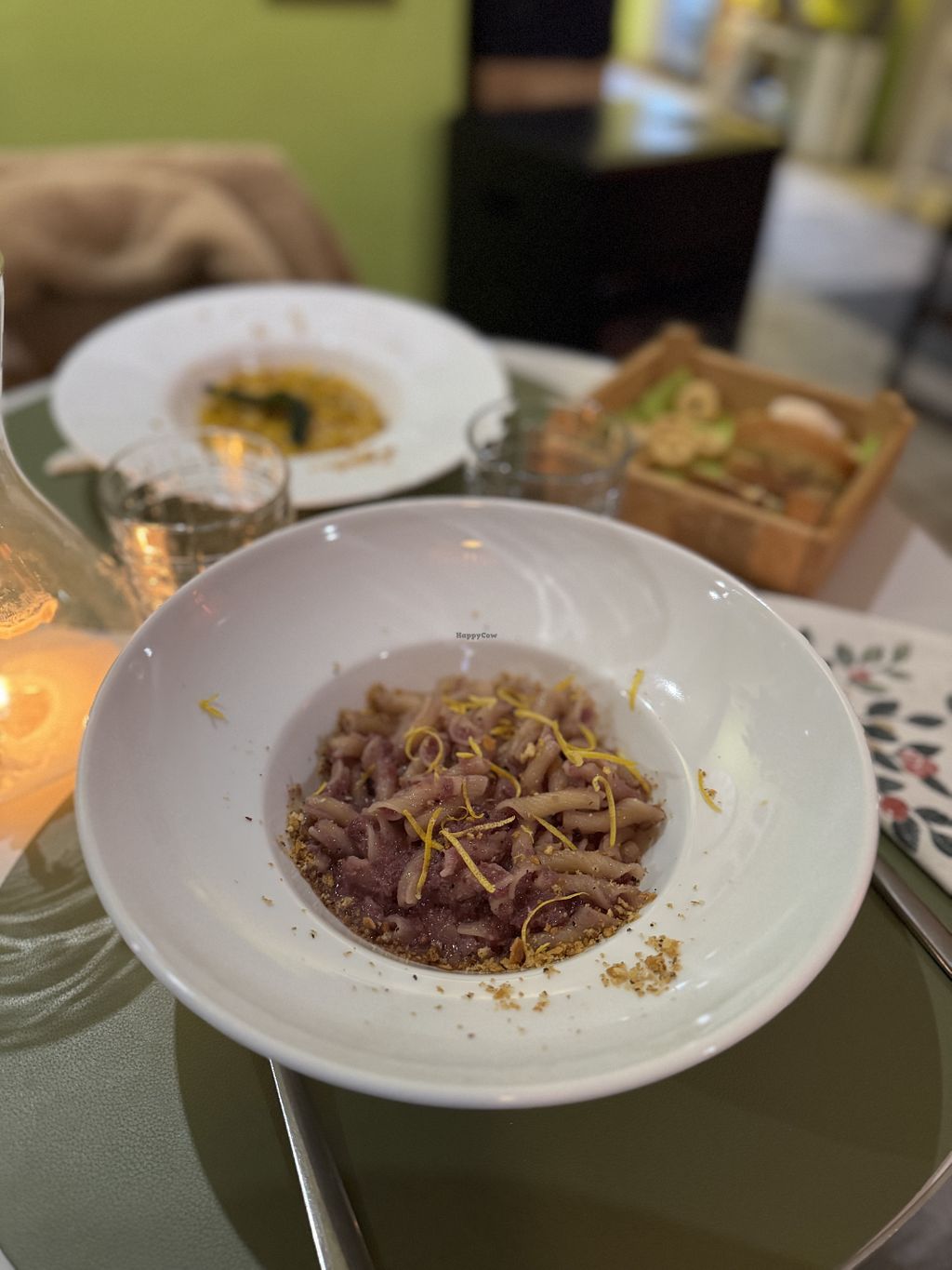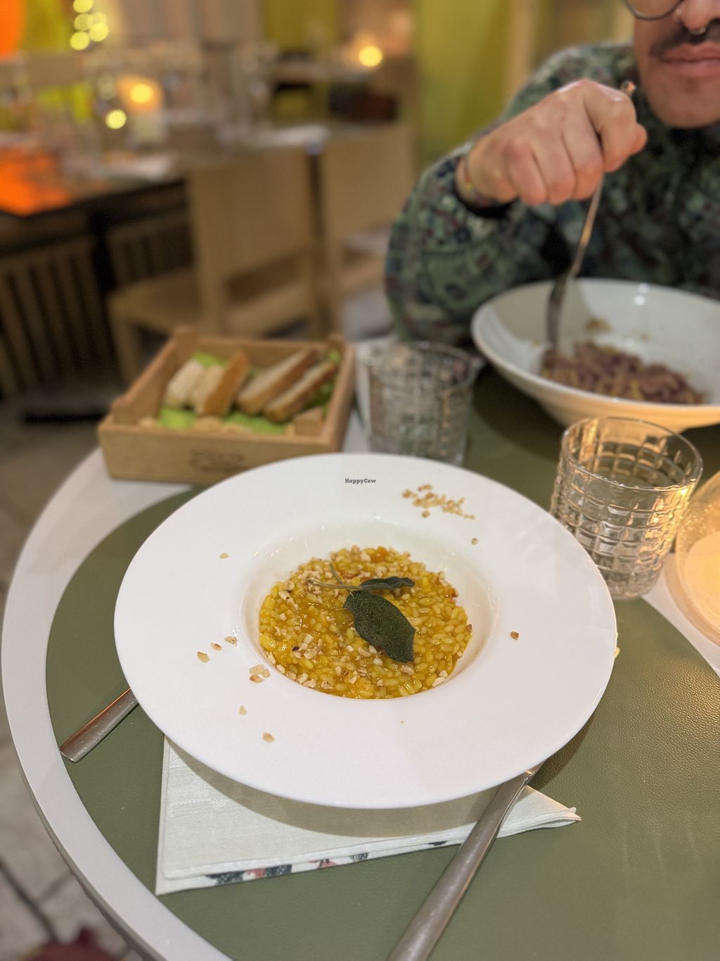 We had luch in the square nearby the restaurant. We shared two starters: a small hummus trio, made of well flavored beatroot and cannellini beans variations; and a 'caponata'-like (sweet and salt fried aubergines, Sicilian-style) dish served with crunchy Sardinian bread. As mains, we had a very tasty fried trio, made of lentils falafel, hand made chips and vegetables tempura (which was the less tasty of the trio); and a pasta made with saffron and lemon cream. We also enjoyed two tiramisù as dessert: choccolate and peach-taste ones. Food and atmosphere were very pleasant, the place is expensive like all the other restaurants in the area, but at least you can enjoy good-prepared vegan food.
