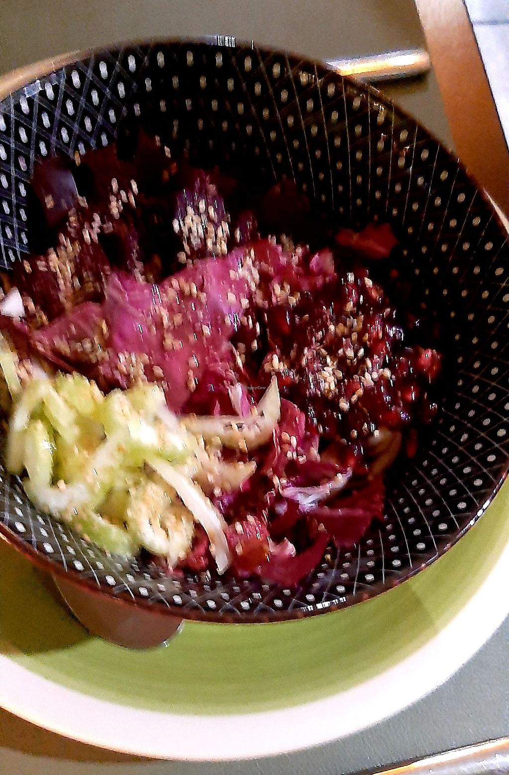 Siamo stati accolti benissimo, abbiamo atteso pochissimo, ci hanno servito un entrèe al cavolo viola con salsa davvero squisita e poi sono subito arrivate le ordinazioni.
