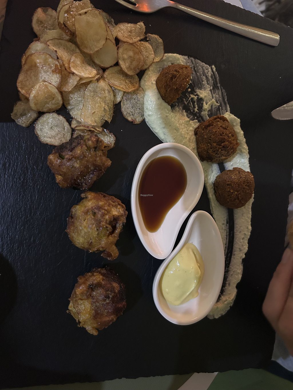 We had luch in the square nearby the restaurant. We shared two starters: a small hummus trio, made of well flavored beatroot and cannellini beans variations; and a 'caponata'-like (sweet and salt fried aubergines, Sicilian-style) dish served with crunchy Sardinian bread. As mains, we had a very tasty fried trio, made of lentils falafel, hand made chips and vegetables tempura (which was the less tasty of the trio); and a pasta made with saffron and lemon cream. We also enjoyed two tiramisù as dessert: choccolate and peach-taste ones. Food and atmosphere were very pleasant, the place is expensive like all the other restaurants in the area, but at least you can enjoy good-prepared vegan food.