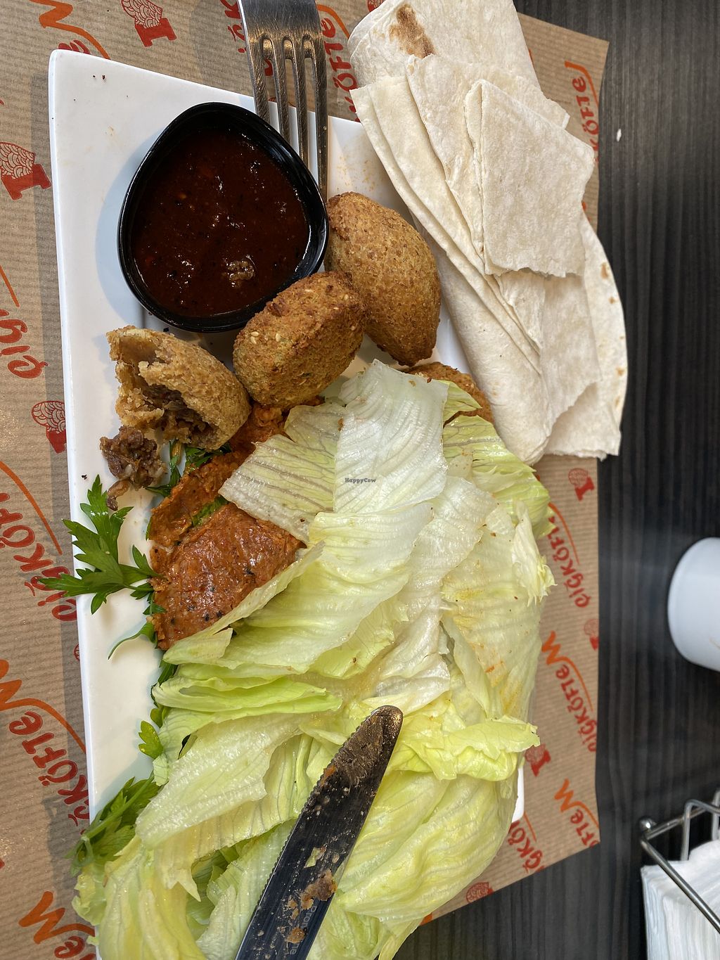Vegan köfte, cigköfte en lamachun besteld. Veel verse groenten en kruiden. Goede smaak!