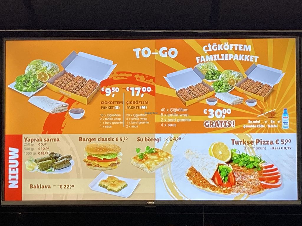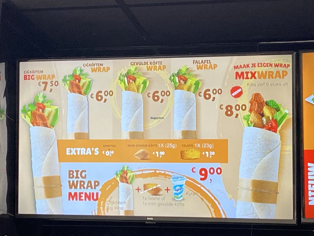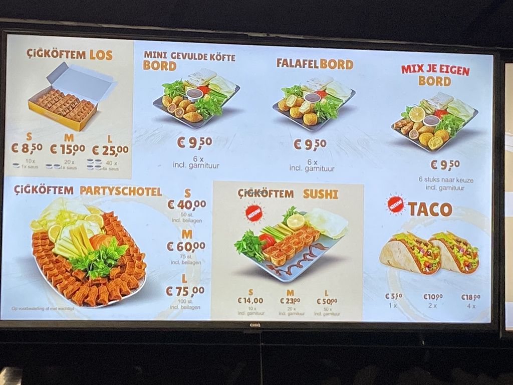 The cigkoftem is vegan, tastes fresh and I really like the flavour of it. You can choose between mild and spicy and I think mild is already hot. You can ask for a taste in the store to figure out if you like the spicy or mild one. The staff is always friendly and they are really fast when you order from home. Also niet expensive. Defintly recommend.