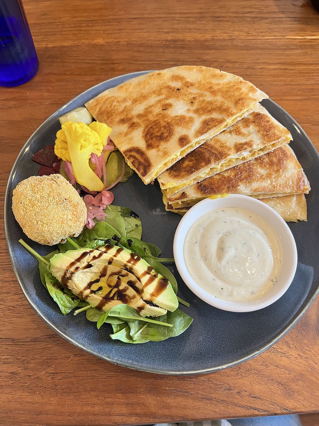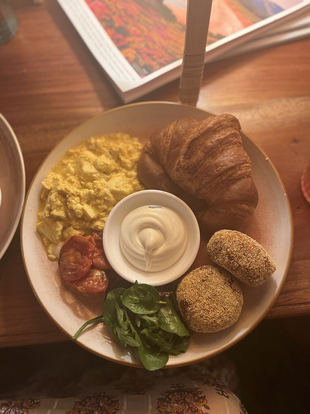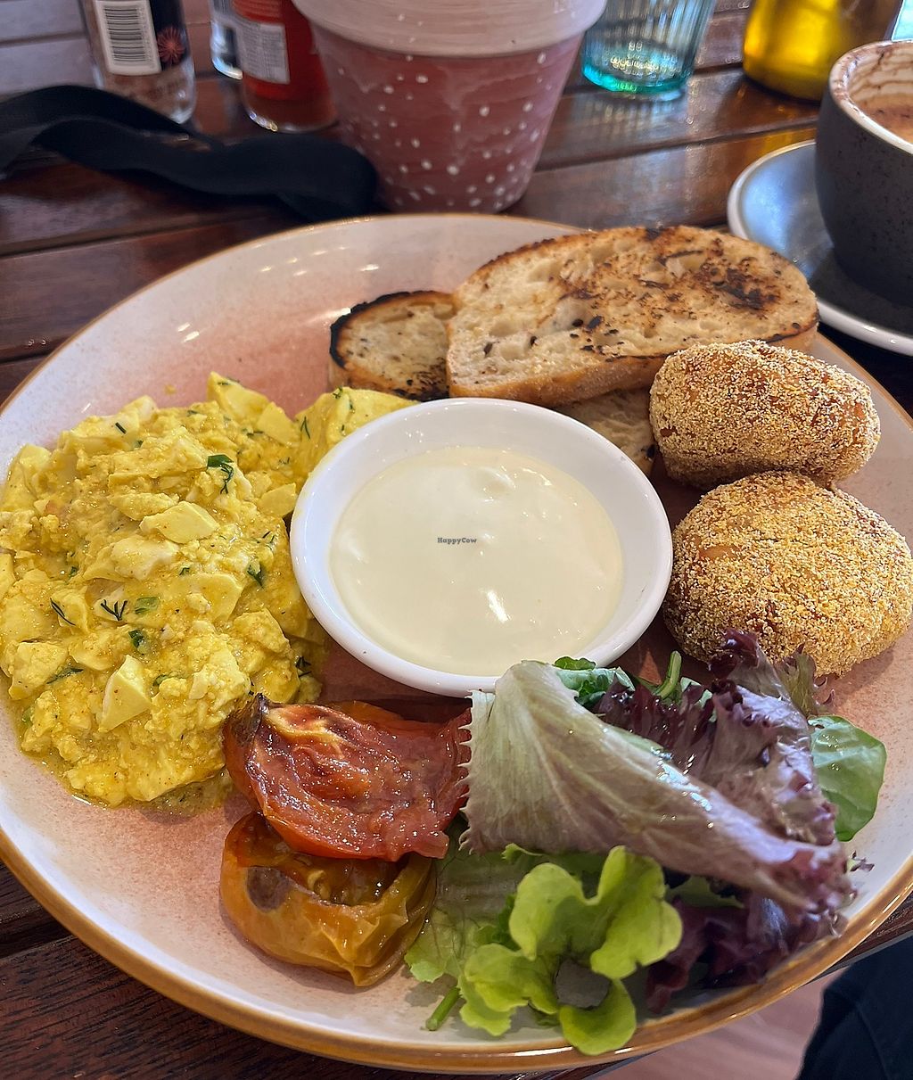 Vegan scrambled eggs with fried rice balls, grilled tomato, salad, toa…