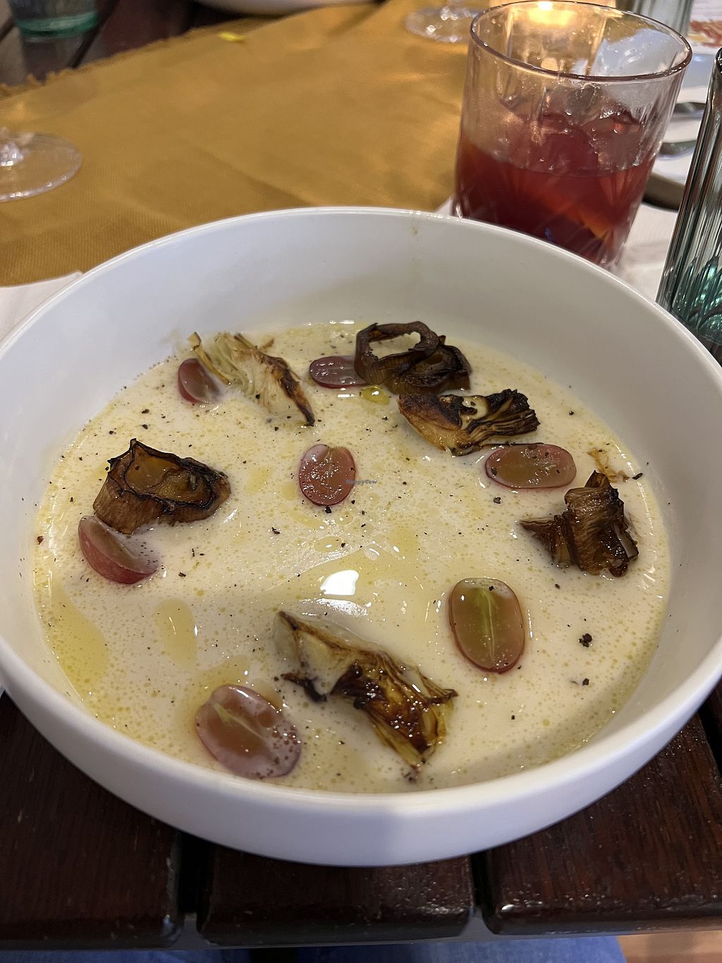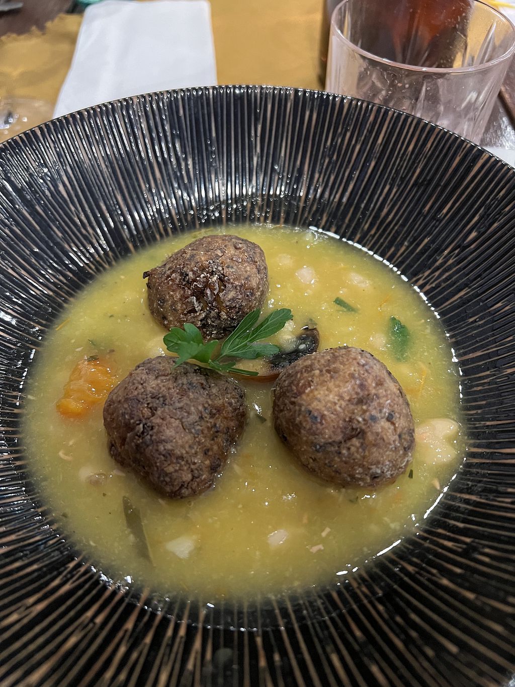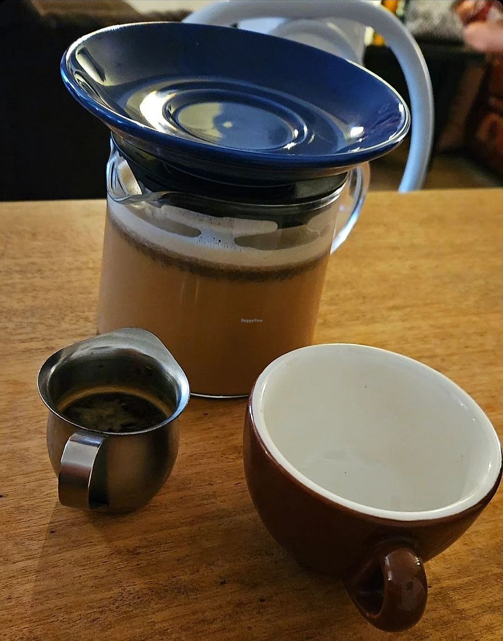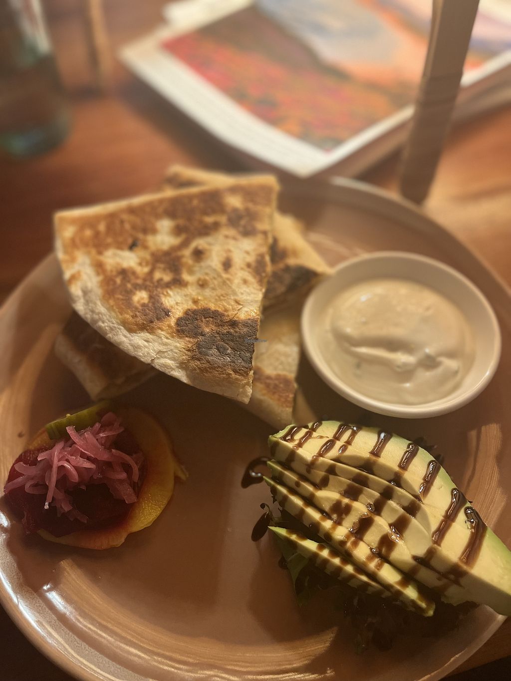 Vegan scrambled eggs with fried rice balls, grilled tomato, salad, toa…