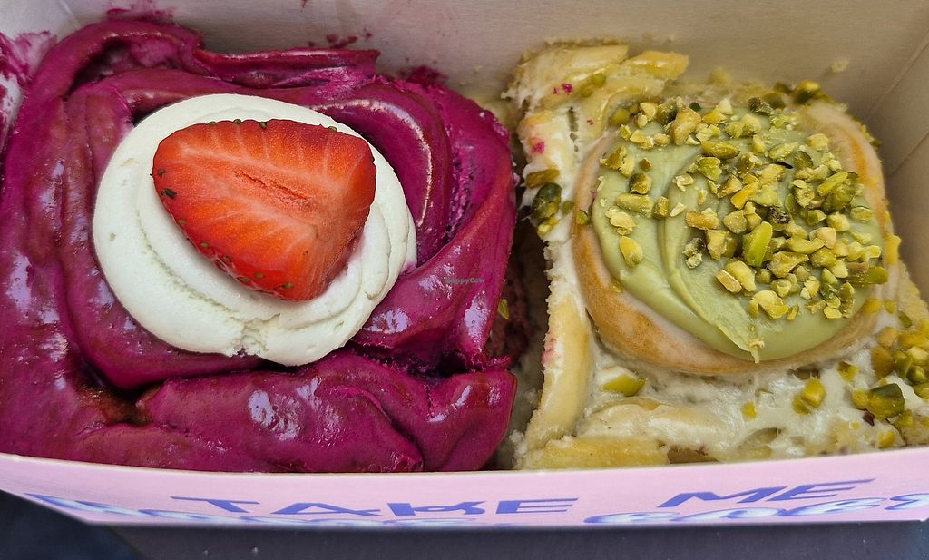 Sehr leckere Zimtschnecken mit vielen verschiedenen Toppings. Wir hatten Pistazie und irgendwas mit Erdbeeren. Beides lecker. Es gibt sehr viele vegane Optionen, mega. Wir fanden die Größe echt mächtig, man könnte sich getrost einen teilen. Wer gerne Süßes ißt, ist hier genau richtig. Auf jeden Fall zu empfehlen.