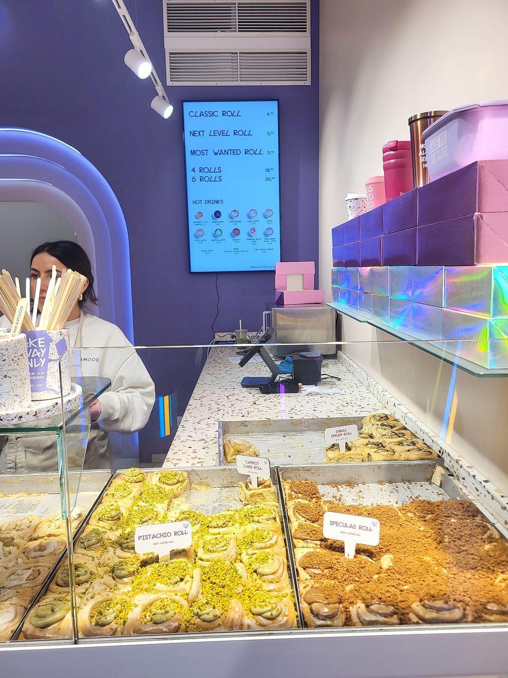 Super fun concept and shop many levels up from the basic Cinnabon stores in the US! Half the pastry are vegan and clearly labeled. Creative flavors and toppings. They are pastry snails like a Cinnabon but have other flavors so don’t expect cinnamon flavor in all of them! The ones with a fruit or moist center are probably better. Depending on when they were made the ones that only have a topping can sometimes be on the dry side