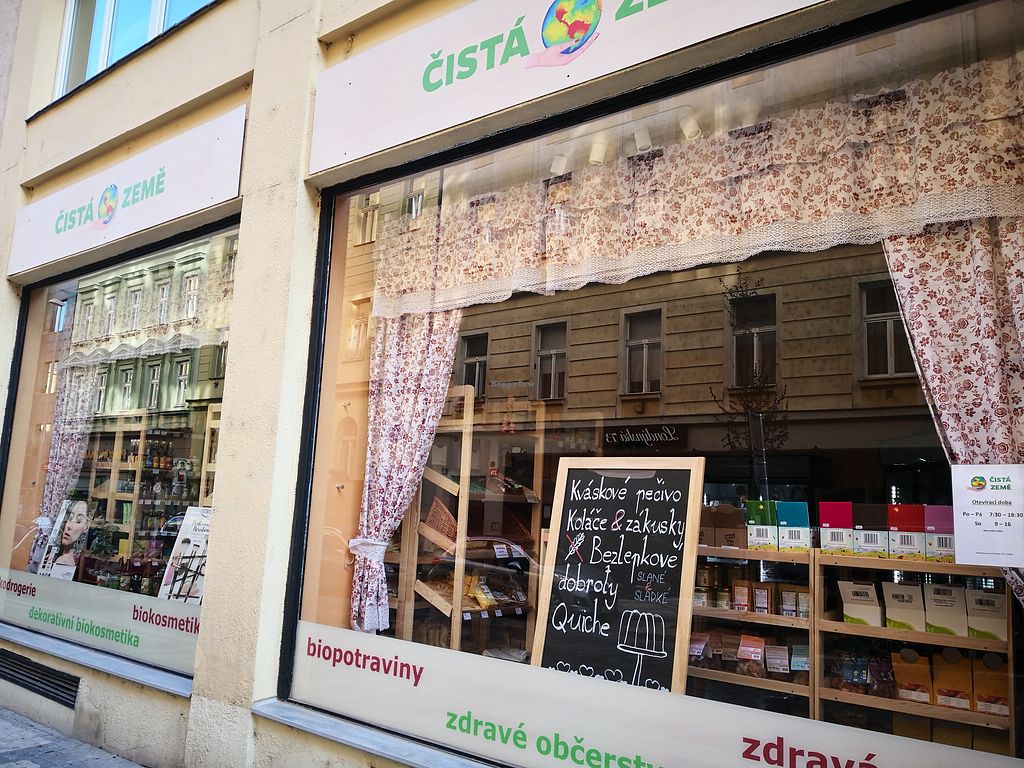 This shop, although small, offers various choices of healthy eats, not even dry and refrigerated goods but also fresh fruits and vegetables, ice-creams and natural cosmetics, even those like in coops aka bring your own containers when it comes to shower gel and laundry. Desserts to go (some vegan) too. Nice and friendly staff. You can collect stamps (one for every 200 czk spent) and get 15% discount once you collect a full card.