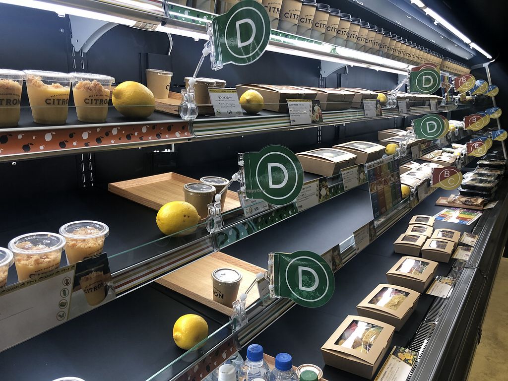 Food shelves. Here you can see which is vegan, gluten-free, free-range…