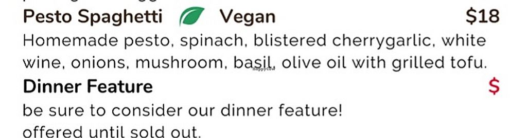 Serves meat, vegan options available. Restaurant with four vegan options: a falafel breakfast plate (specify no butter for the toast), falafel salad, falafel burger, and a pesto spaghetti dish with grilled tofu. Open Tue-Wed 9:00am-3:00pm, Thu-Fri 9:00am-9:00pm, Sat 8:00am-9:00pm, Sun 8:00am-3:00pm.