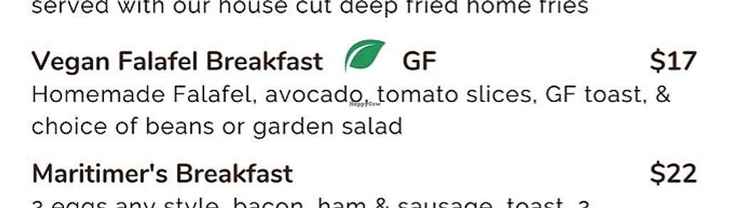 Read moreI got the vegan falafel breakfast with normal non-GF bread which is vegan without the margarine. Did home fries instead of beans.
