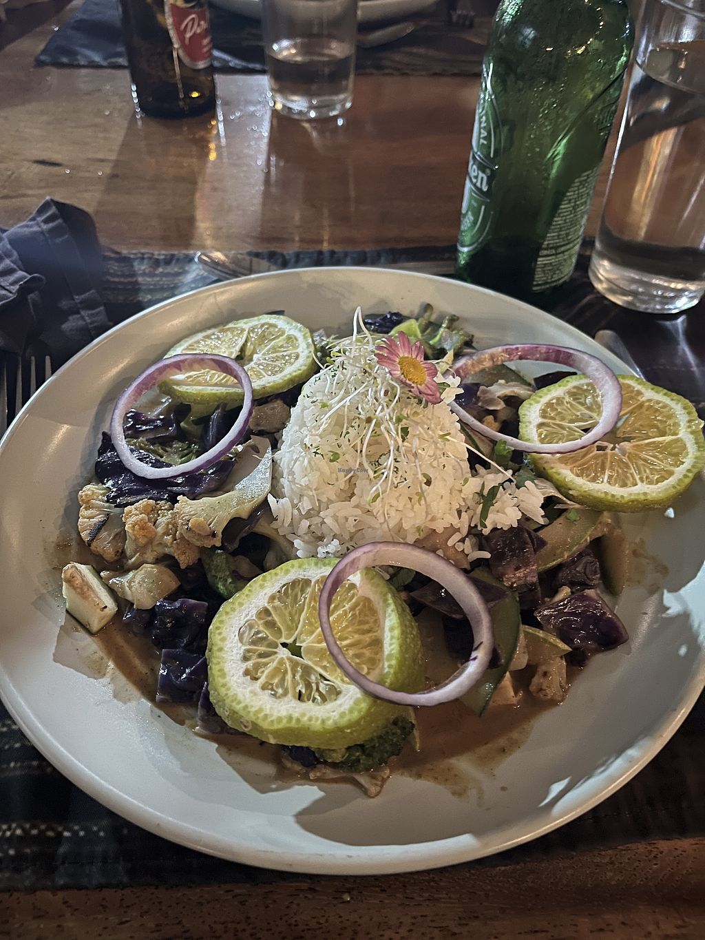 Ordered a vegan chickpea, tofu and aubergine curry which didn’t have any of these ingredients and could barely be called a curry. Just a few fried vegetables with a tiny amount of curry sauce. The flavour was fine but not as described and very overpriced, even for Drake bay. Maybe you would have more luck with something else on the menu