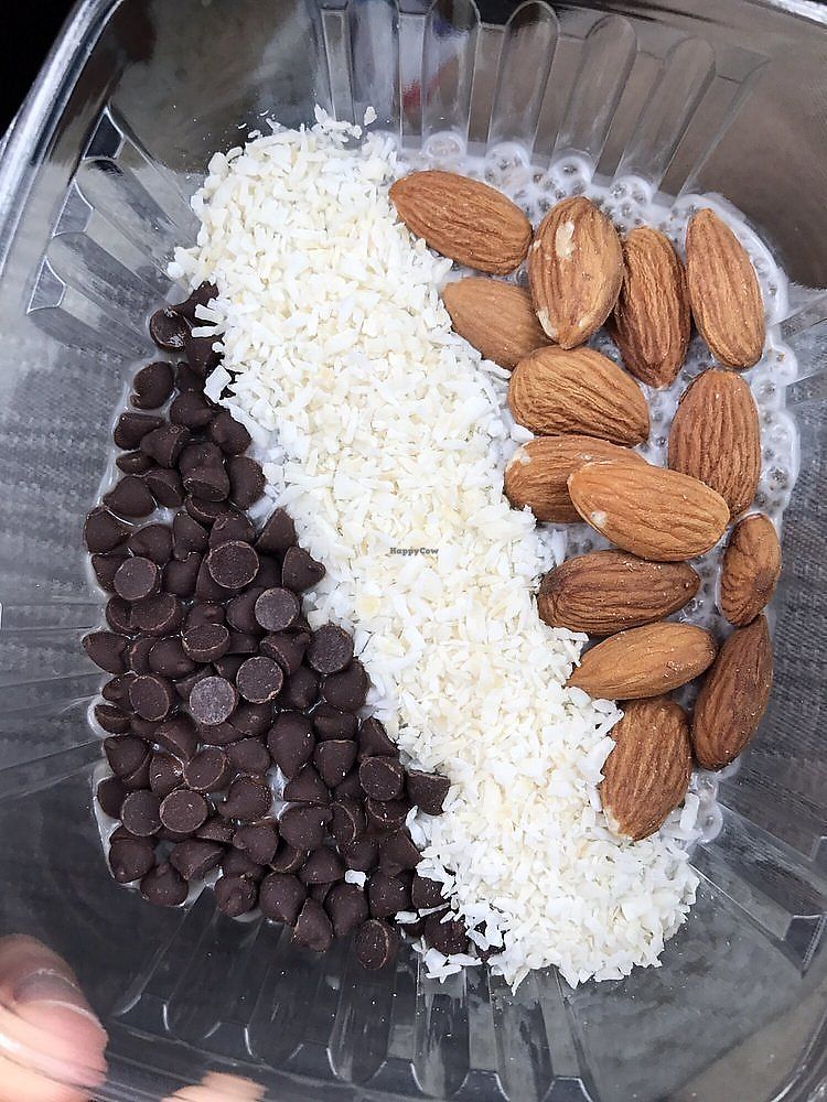 Almond Joy Chia Pudding, with almond, coconut, dark chocolate chips, a…