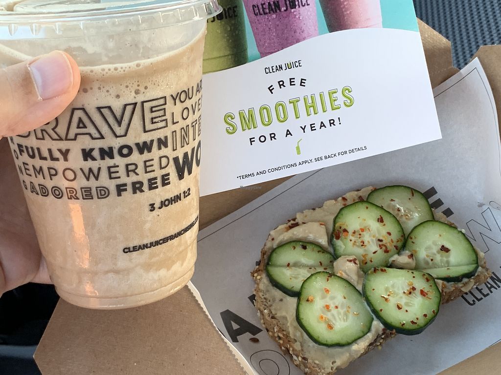 Clean Juice is a faith-based juice and smoothie chain with a nice interior and welcoming staff. If you’re in the mood for a juice, smoothie, or açaí bowl, you can find plenty of vegan options. If you want something more solid, the options are very limited. The only really straight vegan options are The Garden Wrap and The Hummus Toast. Anything else and you’ll have to remove egg, feta, honey, etc. I got the hummus toast with no feta and The Coffee One (coffee based smoothie). The toast wasn’t very filling the coffee smoothie was pretty bland. I wouldn’t go out of my way to go here, but if you need something in a pinch it’s okay.