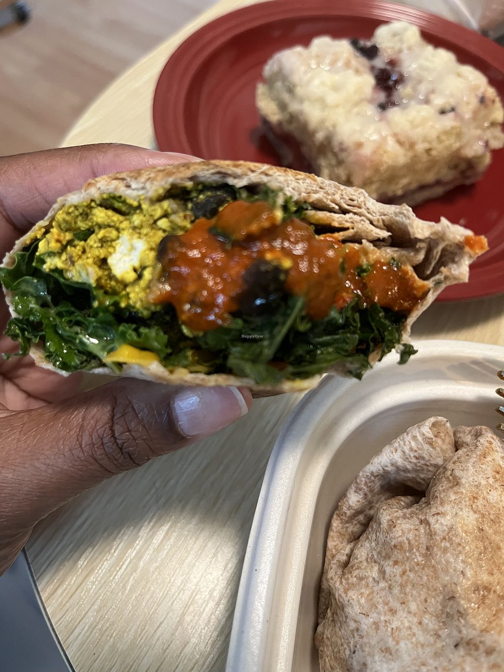 Cons: Sauce was bland, Crunchiness from small kale stems