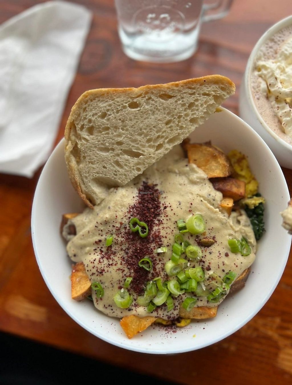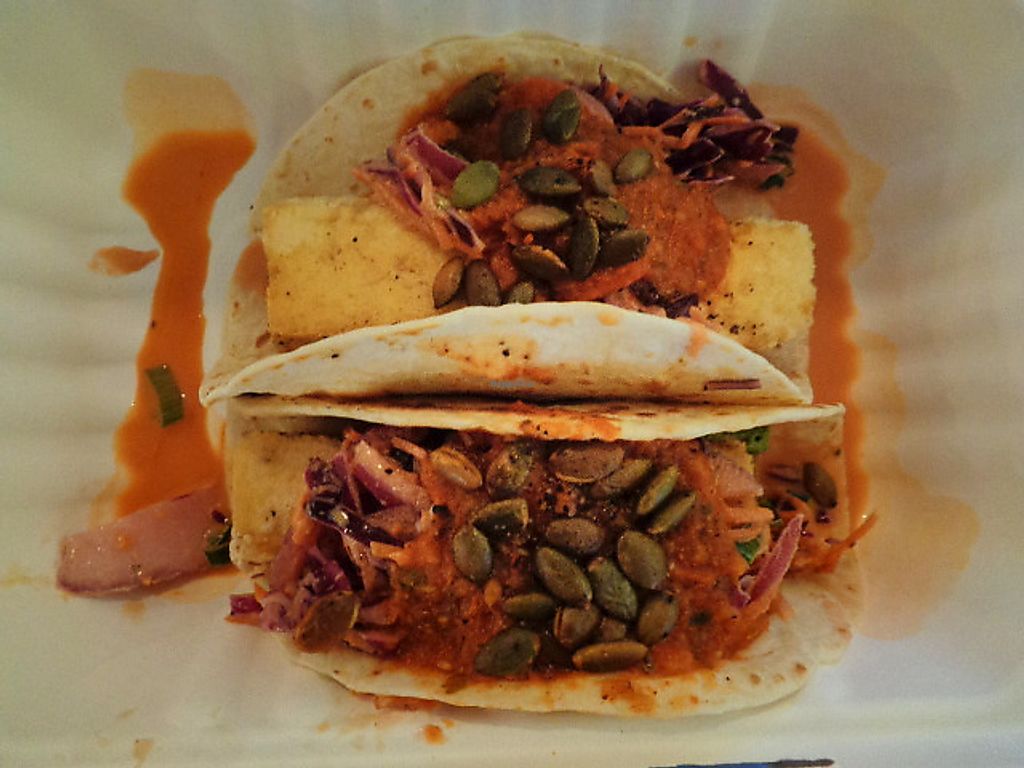 banh mi with fried tofu, chipotle mayo, kimchi, cilantro, scallions, j…