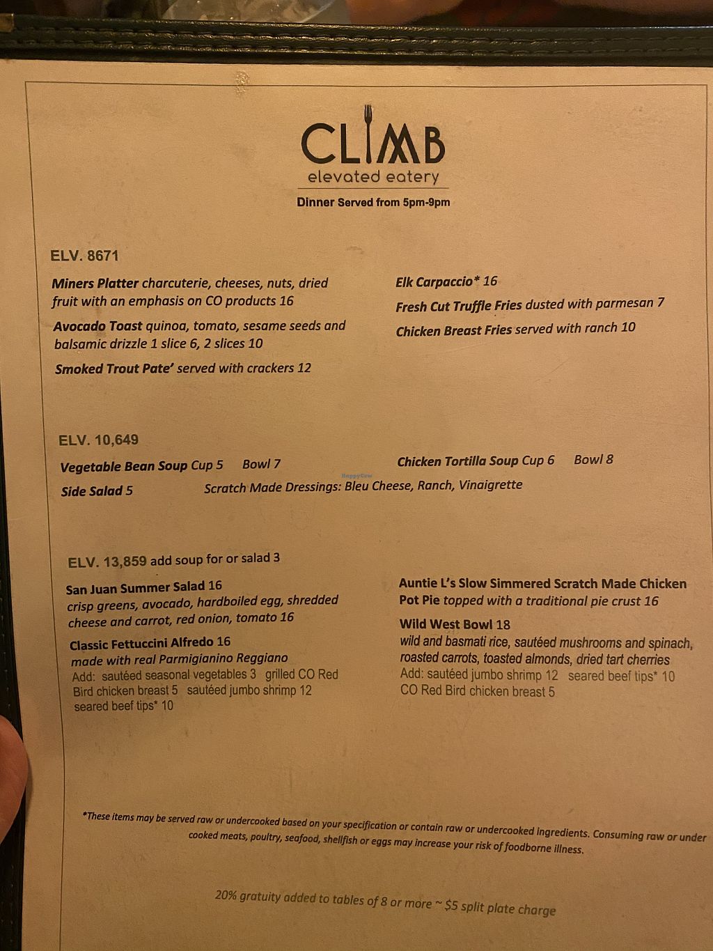 Read moreClimb Elevated Eatery is attempting to provide a fine dining experience, and if you're a carnivore, then you can have all types of dead flesh, but the vegan options are almost non-existent. The Southwest power bowl I ordered had to be 'veganized' with a lemon vinaigrette (in place of an adobe creme). Keep in mind this is a bowl of corn and quinoa, with some black beans, some diced red and green bell peppers, and pepitas. It was very tasty (and also included a very non-descript side-salad), but no matter how far away you are from any other town, $17 was simply outrageous. There appeared to be only one other item on the current menu which could be veganized: "Do the Loop Salad". At $17, including chicken and goat cheese (which further illuminates the absurdity of the power bowl at the same price with no meat or significant protein option), once you remove the chicken and cheese, you've essentially got a $17 side salad. My advice, make sure you bring a cooler with vegan groceries if you're going to spend anytime in Lake City.