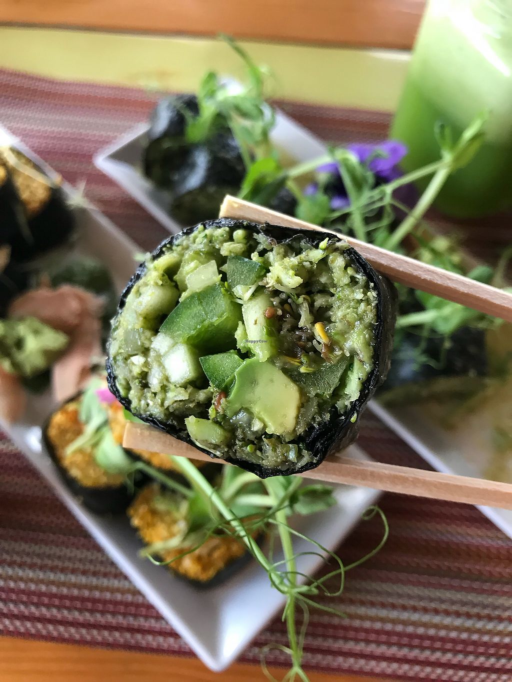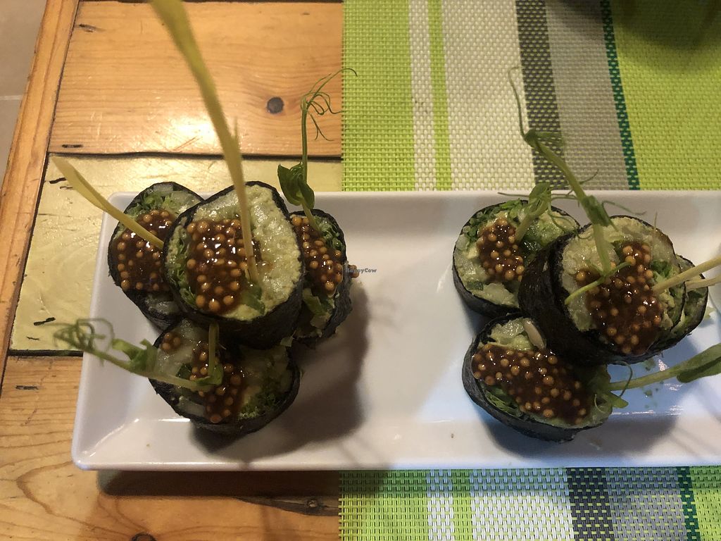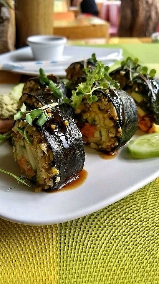 ya playa del carmen tiene muchas opciones veganas, este restaurante está un poco descuidado y sus smoties no los pidan parecen raspados según son con leche vegetal pero están agudos y no tienen buenas combinaciones de sabor. pedimos unos sushi de hummus de chicharo y estaban dos tres nada fuera de lo normal, los postres igual so so nada del otro mundo , las ensaladas con abundantes brotes pero un poco pasados si no les queda de otra aquí está bien porque el horario es amplio pero cierran los domingos