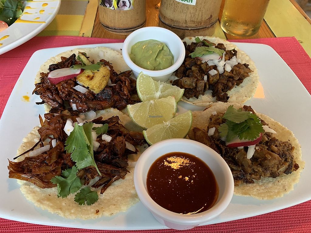 Tried it because it was an all vegan restaurant. There were lots of great sounding options to try, The waitress was very nice. She gave us lots of suggestions. I got a pineapple basil lemonade and my husband got a juice made with chaya. Both were delicious. I got a selection of 3 tacos: the jackfruit carnitas, the BBQ jackfruit, and the potato chickpea. The carnitas taco was not good. It was super dry and charred. The bbq had a spicy sauce, that was good. My favorite was the potato chickpea. It had a nice blend of spices that made it taste more like Indian food than Mexican. My husband got a sandwich made with an olive tampenade and came with roasted root vegetables on the side. He liked it and the vegan mayo sauce they gave him for dipping. We finished the meal with the brownie and hazelnut milk ice cream. It was divine. Even if you aren't that hungry, I recommend trying this place just for the juice or the desserts.