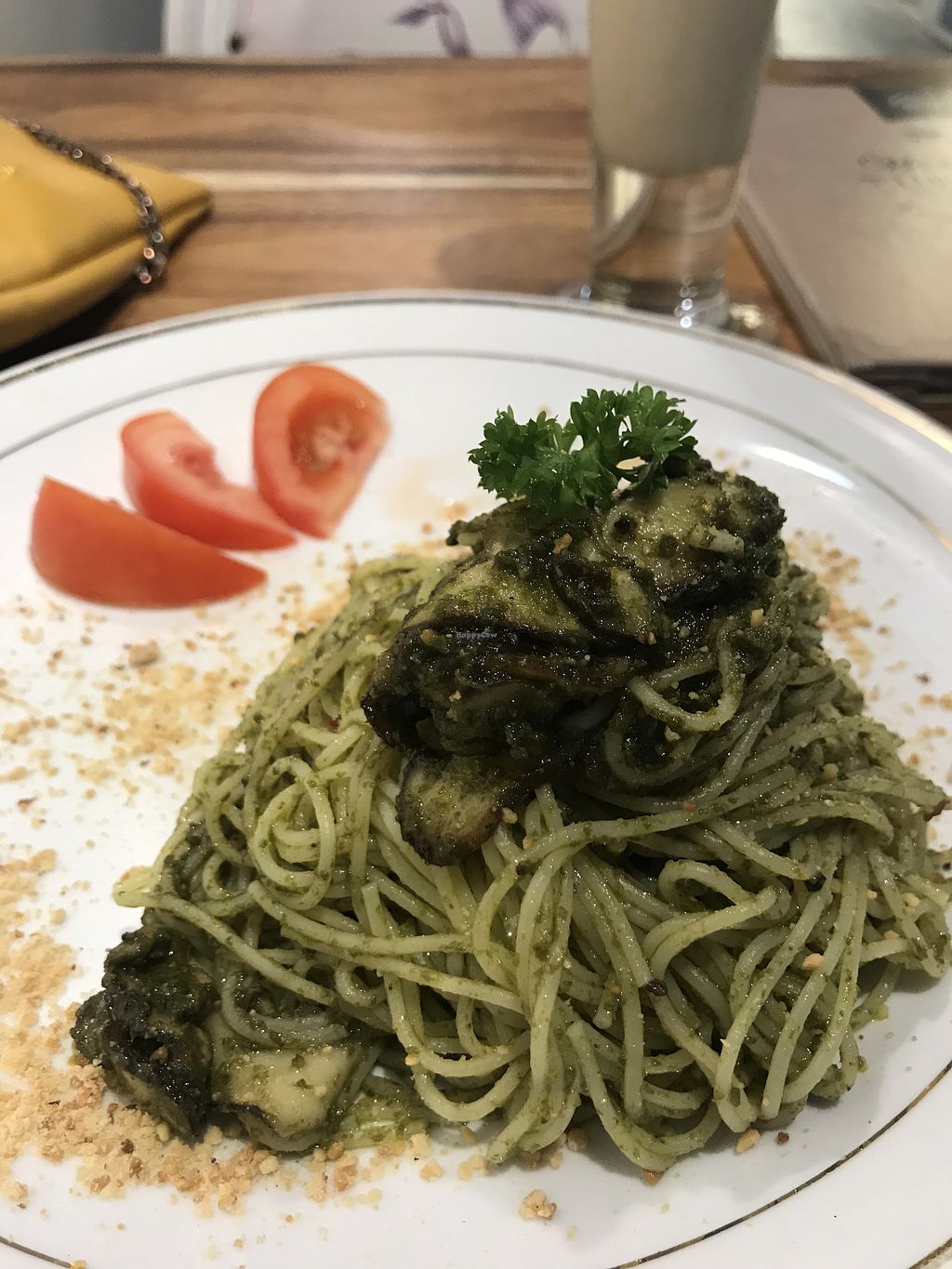 pesto pasta (and fancy looking vinegar drink in the background)