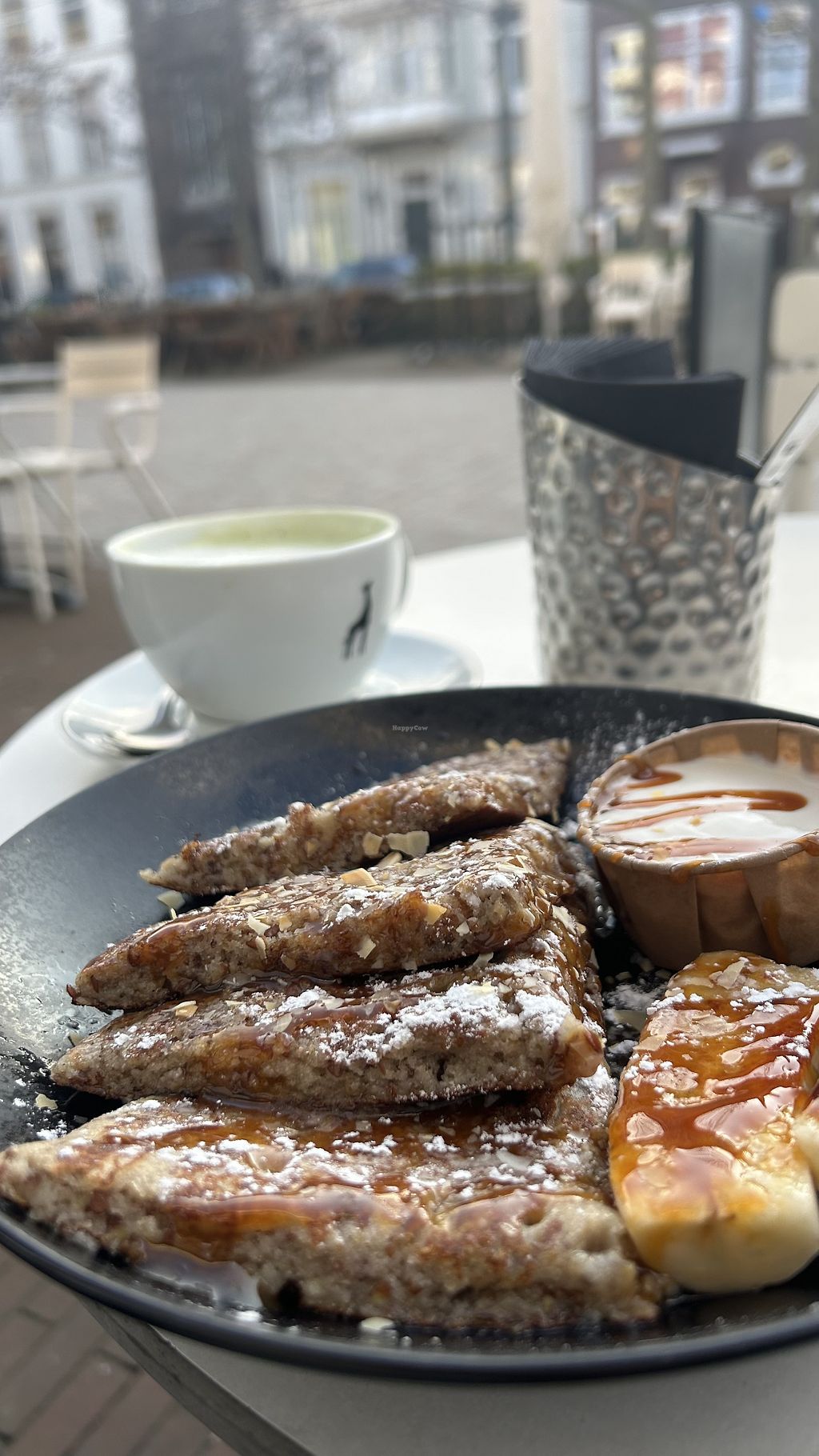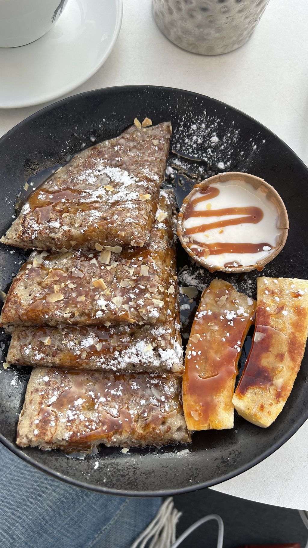 Vegan caramelized banana pancakes with coconut yogurt, really sweet anβ¦