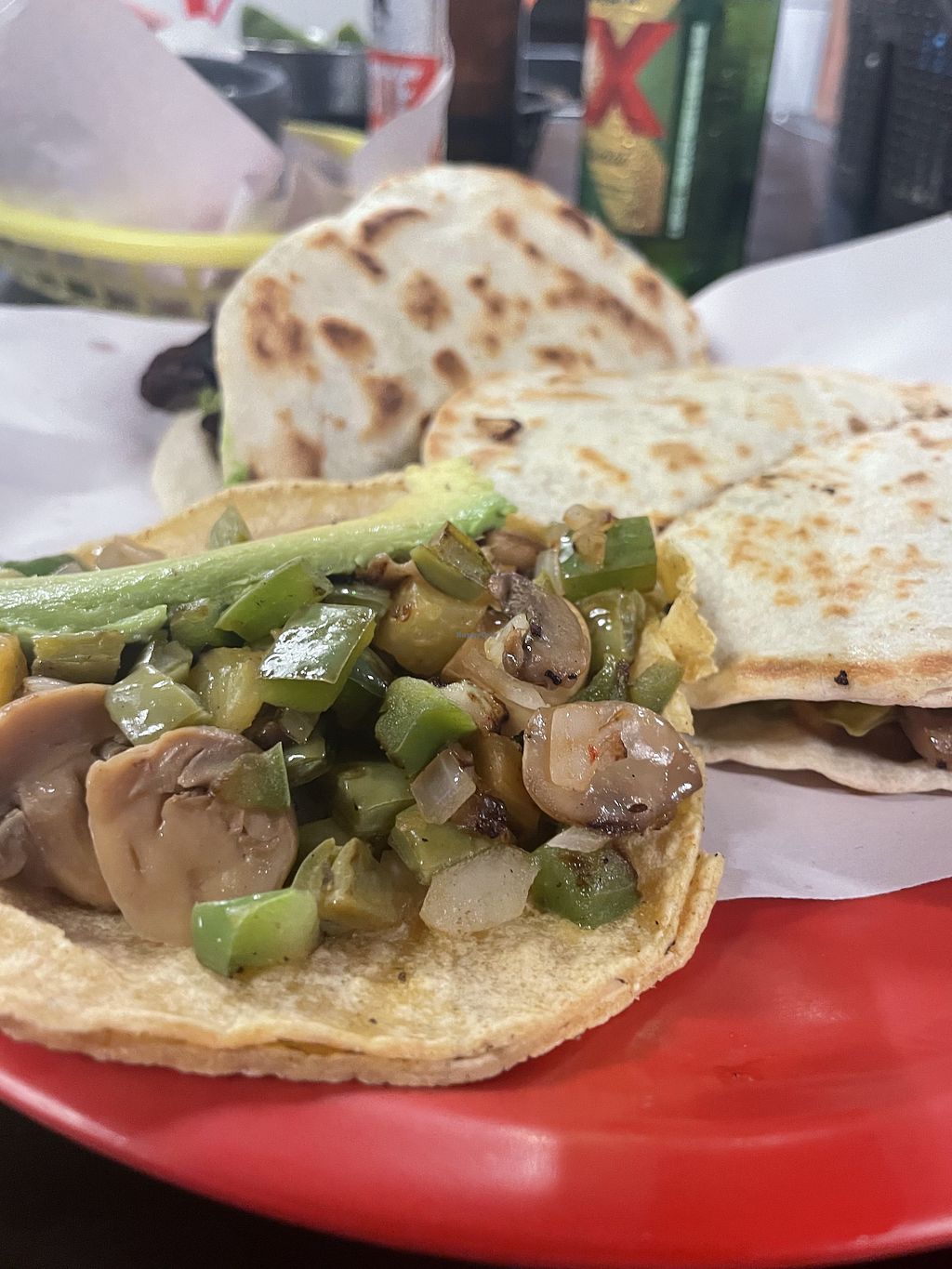 Serves meat, vegan options available. Mexican taco restaurant with vegan choices. Menu includes chips and guacamole, three vegetable tacos with avocado and a vegetable bean torta. Open Mon-Sun 10:00am-1:00am.