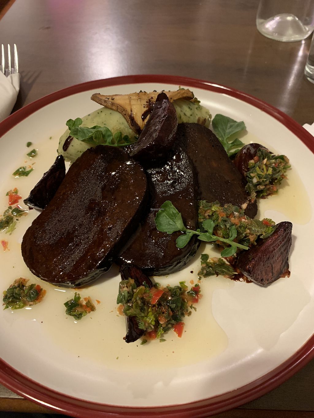 So great to have so many inventive options however perhaps because of the butcher in their name most of the dishes were positioning themselves as faux-meat which is fine but a bit limited in its view. For what you pay the portions are not generous. I had the seitan steak for a main which stuck in my throat a little because it was so thick and a little dry however my starter of cannelloni was so light and delicious. The strawberry cheesecake we got for dessert was actually terrible, dry and tasteless. We had heard of this place through the good reviews on happy cow but were disappointed with our experience. Better in idea than execution.