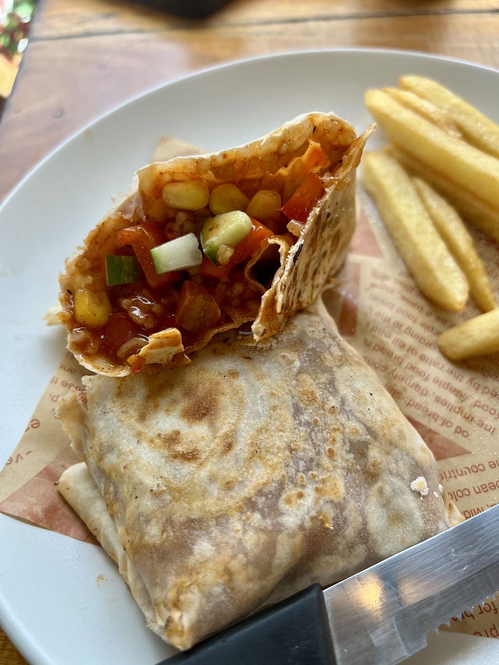 We ordered the burrito filled with tofu, corn, rice, onion and bell peppers. Make sure to ask without the cheese to make it vegan. Comes with fries. Although the burrito was tasty, it was so small that we finished it in about 5 small bites. The fries portion was a joke. Anyway, it was cheap so I guess you get what you pay for.