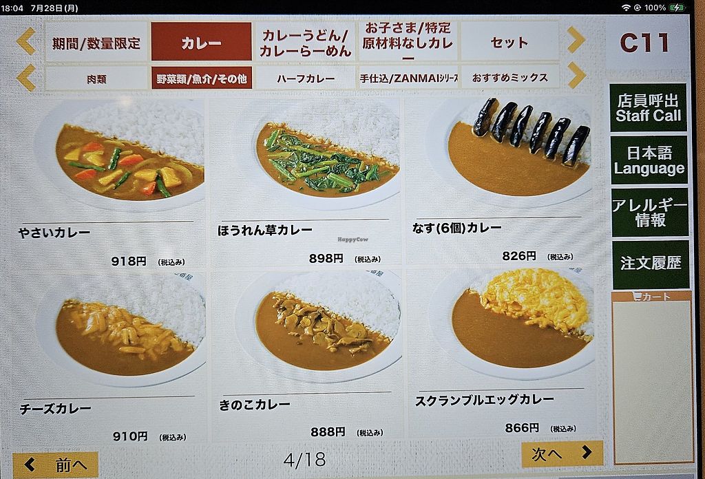 This location has 4 vegan (plain curry and rice, vegetable, spinach and mushroom) and 1 vegetarian option (scrambled eggs). The flavour was good, but there were no options for soy meat etc. and as I find is common the amount of vegetable in the actual dish was fairly low. Still, it's great to see a bigger Japanese chain have any options!